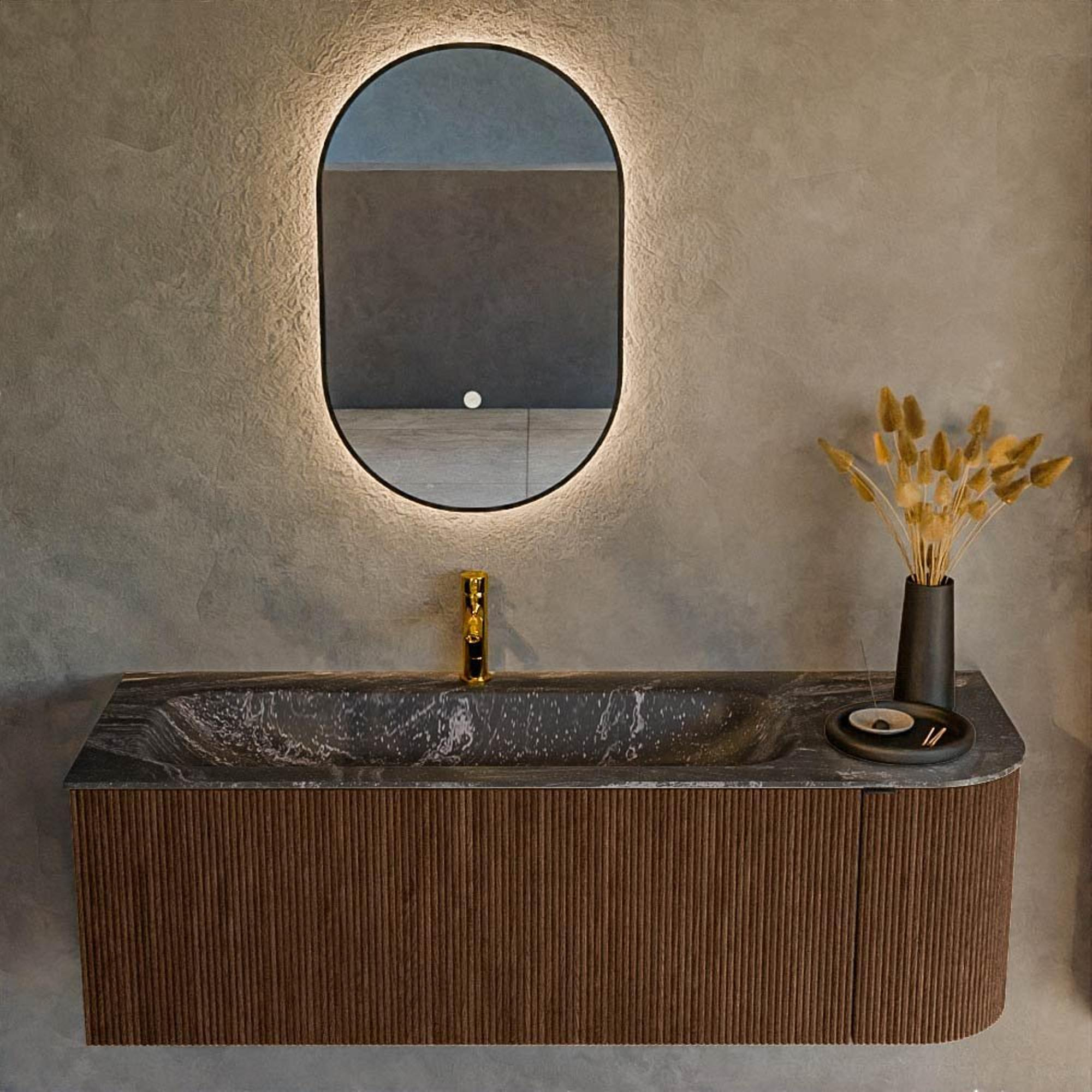 - Teinte chaleureuse Walnut combinée à un plan de lavabo couleur lave/anthracite pour un contraste luxueux.