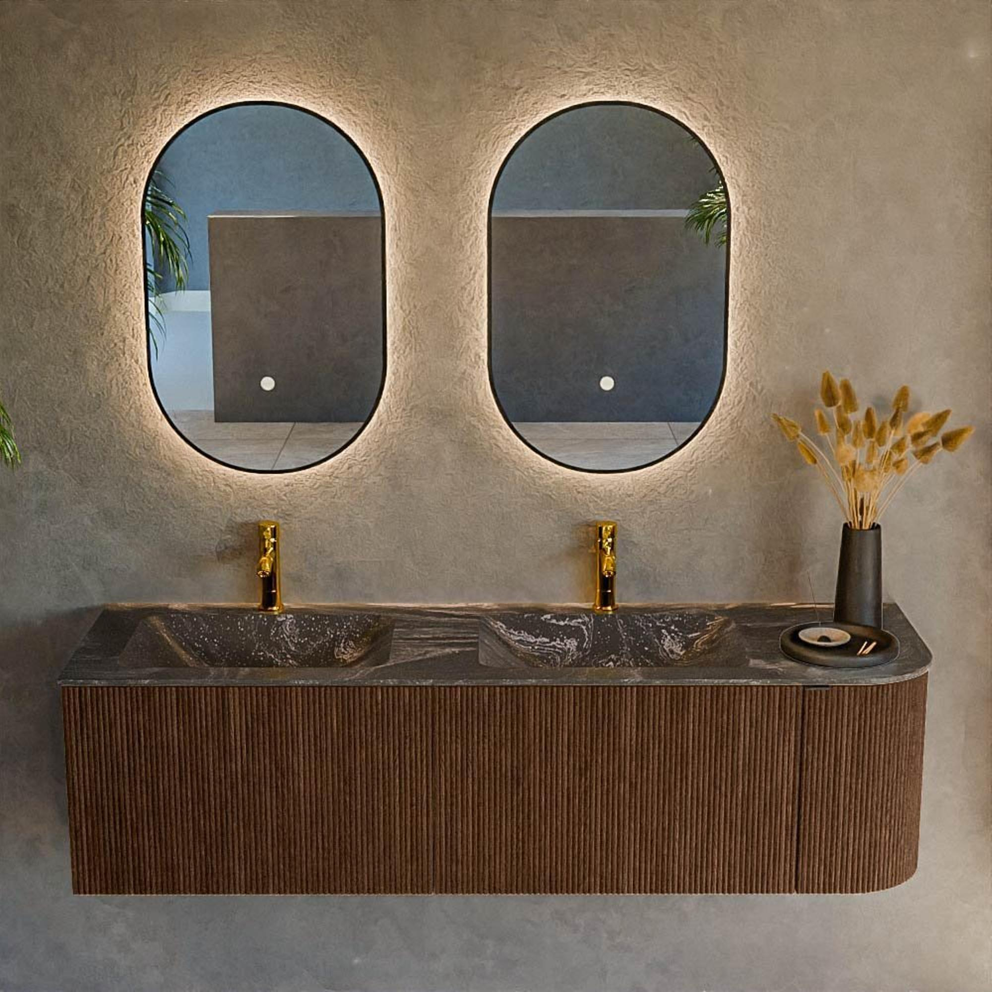 MONDIAZ KURVE-DLUX meuble de salle de bains 155 cm avec module 25 R couleur Walnut avec 2 tiroirs et 1 porte. Vasque LEAF double / gauche 2 trous de robinet couleur Lava.
