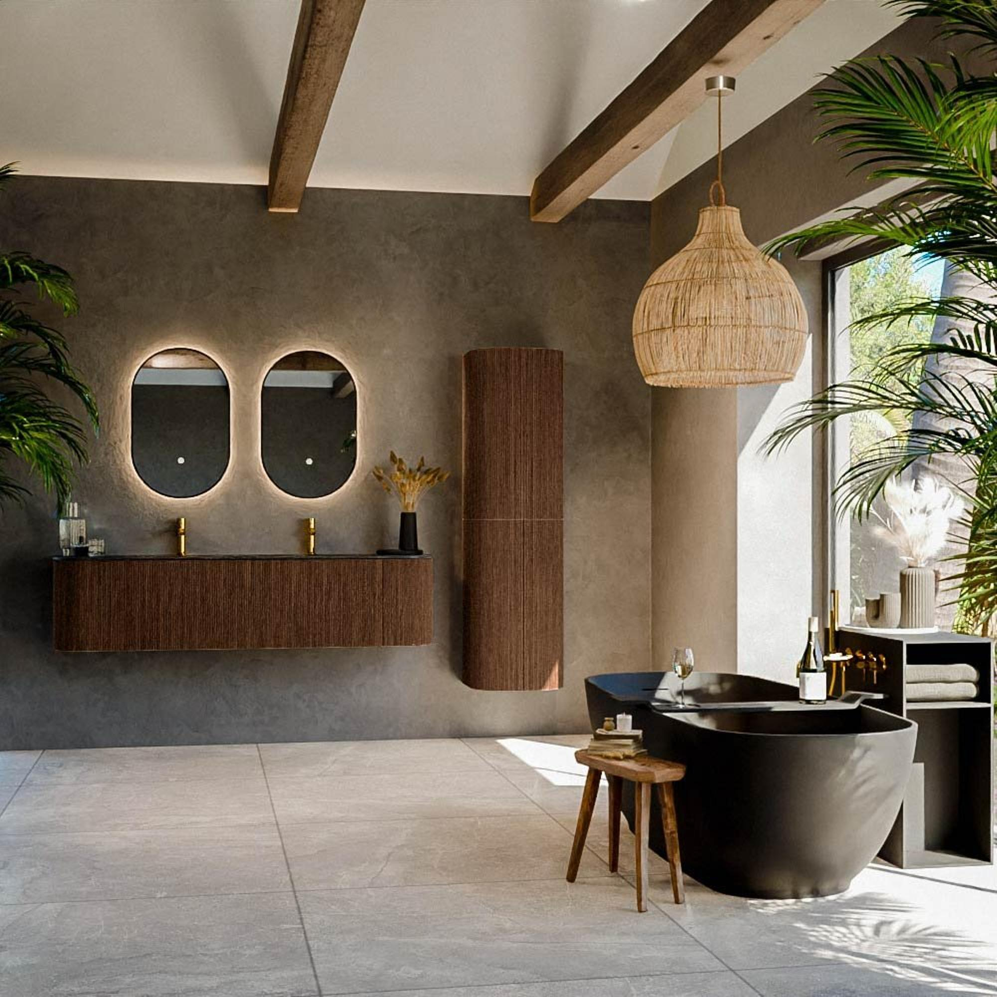 - Façades couleur Walnut avec effet bois pour une atmosphère chaleureuse et naturelle dans la salle de bains.