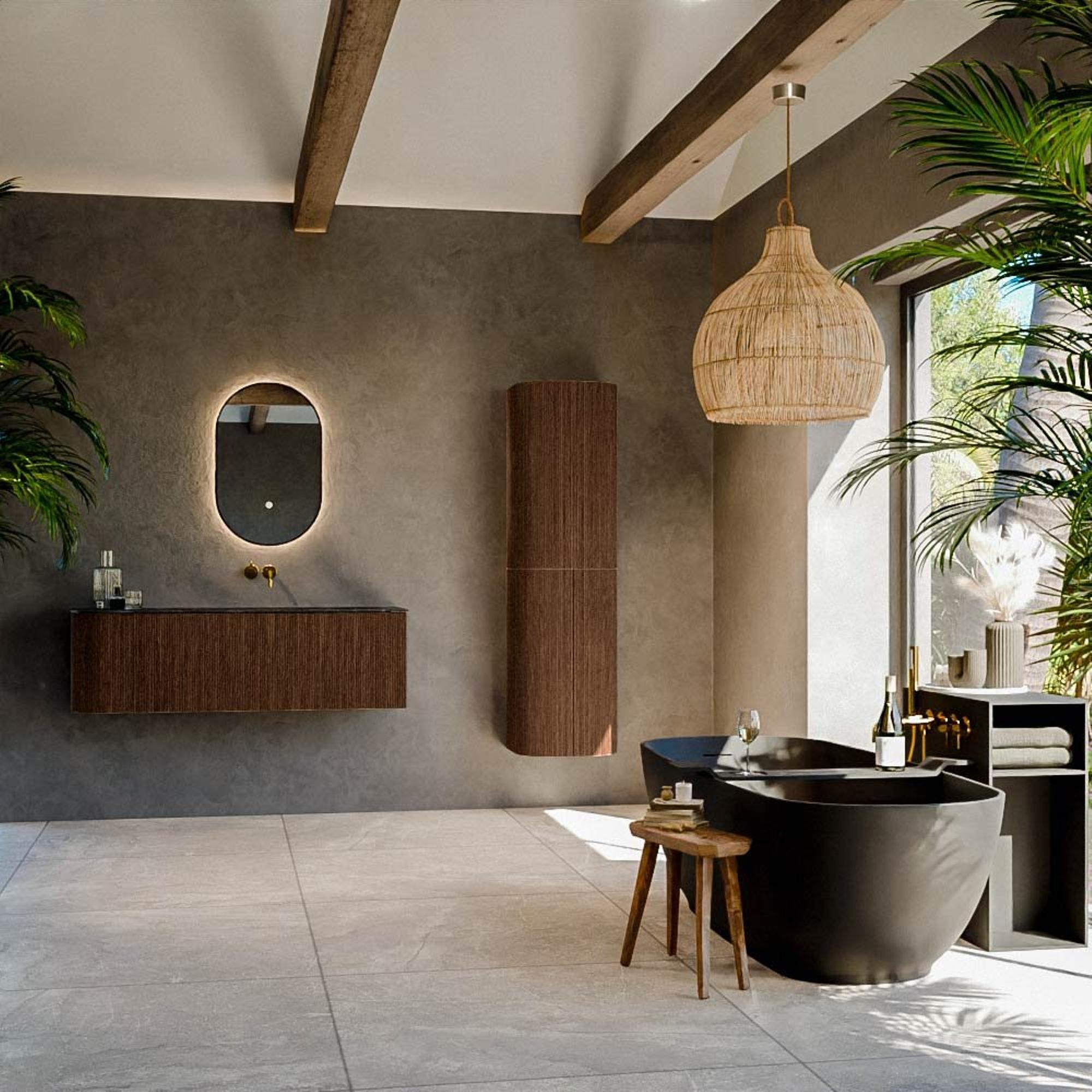 Outre l’apparence, la durabilité est un argument important dans le choix d’un meuble de salle de bains. La finition de qualité en couleur walnut est conçue pour une utilisation de nombreuses années et conserve son bel aspect avec un entretien normal. Le lavabo et le plan de couleur Lava sont fabriqués dans un matériau solide et facile d’entretien qui se nettoie aisément. La surface antibactérienne aide à limiter la prolifération des bactéries, ce qui est non seulement plus hygiénique, mais apporte aussi de la tranquillité dans le nettoyage quotidien. Comme le lavabo est réalisé sans trop-plein et sans bonde intégrée, vous avez en outre la flexibilité de sélectionner vous-même une évacuation et un siphon assortis au style de vos autres robinets et accessoires, par exemple en chrome, noir ou métal brossé.
