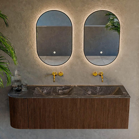 La couleur walnut avec véritable aspect bois donne immédiatement à votre salle de bains une ambiance chaleureuse et accueillante, tandis que les lignes épurées et la forme rectangulaire aux angles arrondis s’intègrent parfaitement dans un intérieur moderne. La combinaison avec la double vasque LEAF couleur lava crée un contraste élégant : l’anthracite profond de la vasque a un aspect luxueux et intemporel, et se marie à merveille avec des robinets et accessoires noirs, chromés ou en métal brossé. Grâce à la pose murale, le meuble semble flotter, ce qui n’est pas seulement élégant mais agrandit aussi visuellement votre salle de bains. Vous créez ainsi, avec un seul meuble, un ensemble harmonieux où design et chaleur se rejoignent parfaitement.