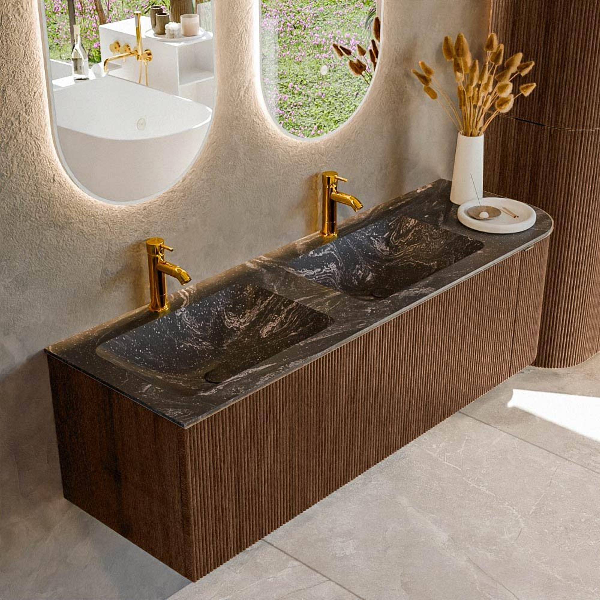 Vous cherchez un meuble de salle de bains élégant, à la fois pratique et chaleureux, qui s’intègre parfaitement dans une salle de bains moderne ou de style spa luxueux ? Alors cet ensemble généreux avec meuble aspect bois et lavabo assorti est un choix judicieux. Grâce à son montage suspendu, il paraît léger et aéré, tandis que la combinaison du ton chaud Walnut et du lavabo Lava au caractère affirmé apporte beaucoup de personnalité. Grâce au lavabo double, ce meuble est idéal pour un foyer animé, un couple qui aime commencer la journée en même temps ou pour toute personne qui apprécie simplement un confort et un espace supplémentaires pour se laver et se brosser les dents. Les formes arrondies offrent une apparence douce et conviviale et rendent en plus le meuble agréable à utiliser dans les espaces plus petits ou le long des passages, car l’on se cogne moins facilement. Si vous recherchez un meuble de salle de bains intemporel qui met en équilibre design, fonctionnalité et confort d’utilisation au quotidien, cette solution complète est parfaitement adaptée.