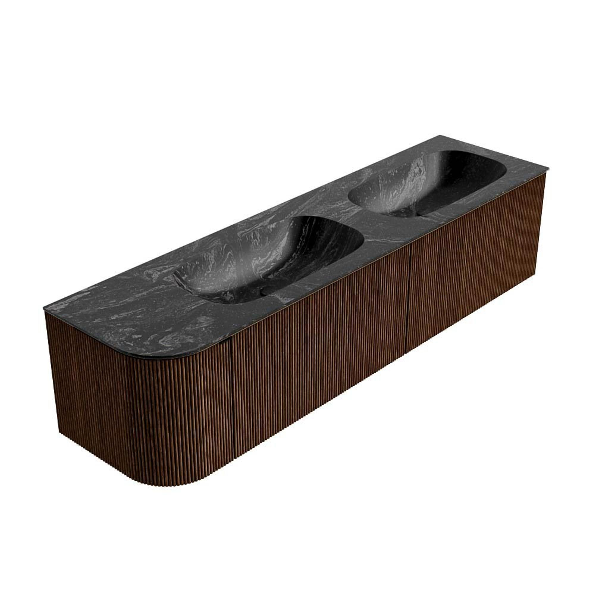 MONDIAZ KURVE-DLUX meuble de salle de bains 175 cm avec module 25 L couleur Walnut avec 2 tiroirs et 1 porte. Lavabo STOR SMALL double / droite sans trou de robinet couleur Lava.