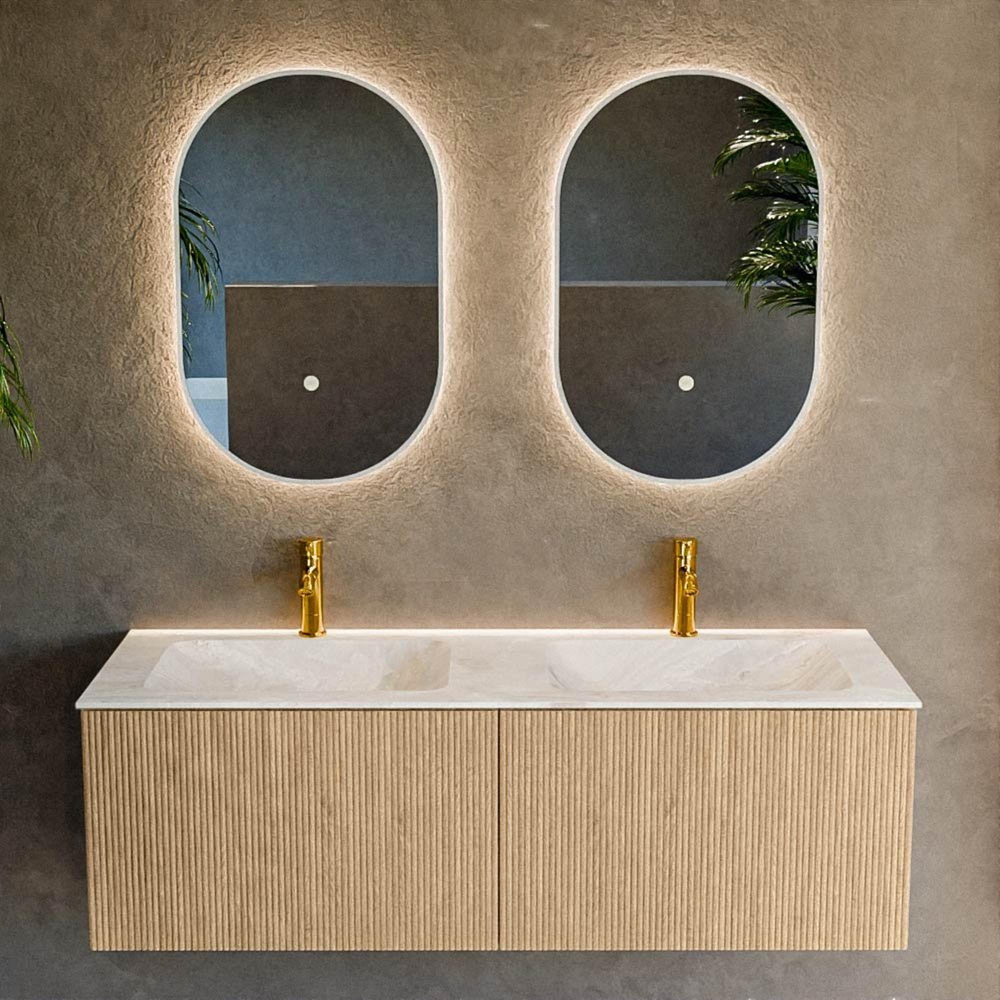 MONDIAZ KURVE-DLUX Meuble de salle de bains 130cm couleur Oak avec 2 tiroirs. Lavabo LEAF double 2 trous de robinet couleur Frappe.