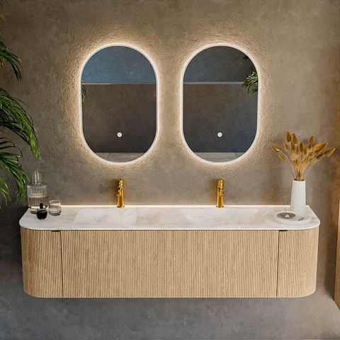 Ce meuble de salle de bains haut de gamme est idéal si vous souhaitez aménager une salle de bains spacieuse et moderne dans laquelle confort et esthétique sont parfaitement équilibrés. Grâce à sa largeur généreuse, il offre suffisamment de place pour utiliser le lavabo à deux en même temps, sans se gêner. La combinaison d’un chaleureux aspect bois et d’un lavabo beige doux rend ce meuble particulièrement adapté aux intérieurs contemporains, du style scandinave lumineux au style hôtel chic. Les lignes épurées avec des angles subtilement arrondis créent une apparence calme et luxueuse, tandis que l’agencement étudié avec tiroir et portes vous aide à ranger clairement toutes vos affaires du quotidien. En optant pour un meuble suspendu, le sol paraît plus spacieux et le nettoyage devient plus facile. Ce modèle est donc un choix judicieux si vous recherchez une solution élégante, pratique et pérenne pour la salle de bains familiale ou une grande suite parentale.