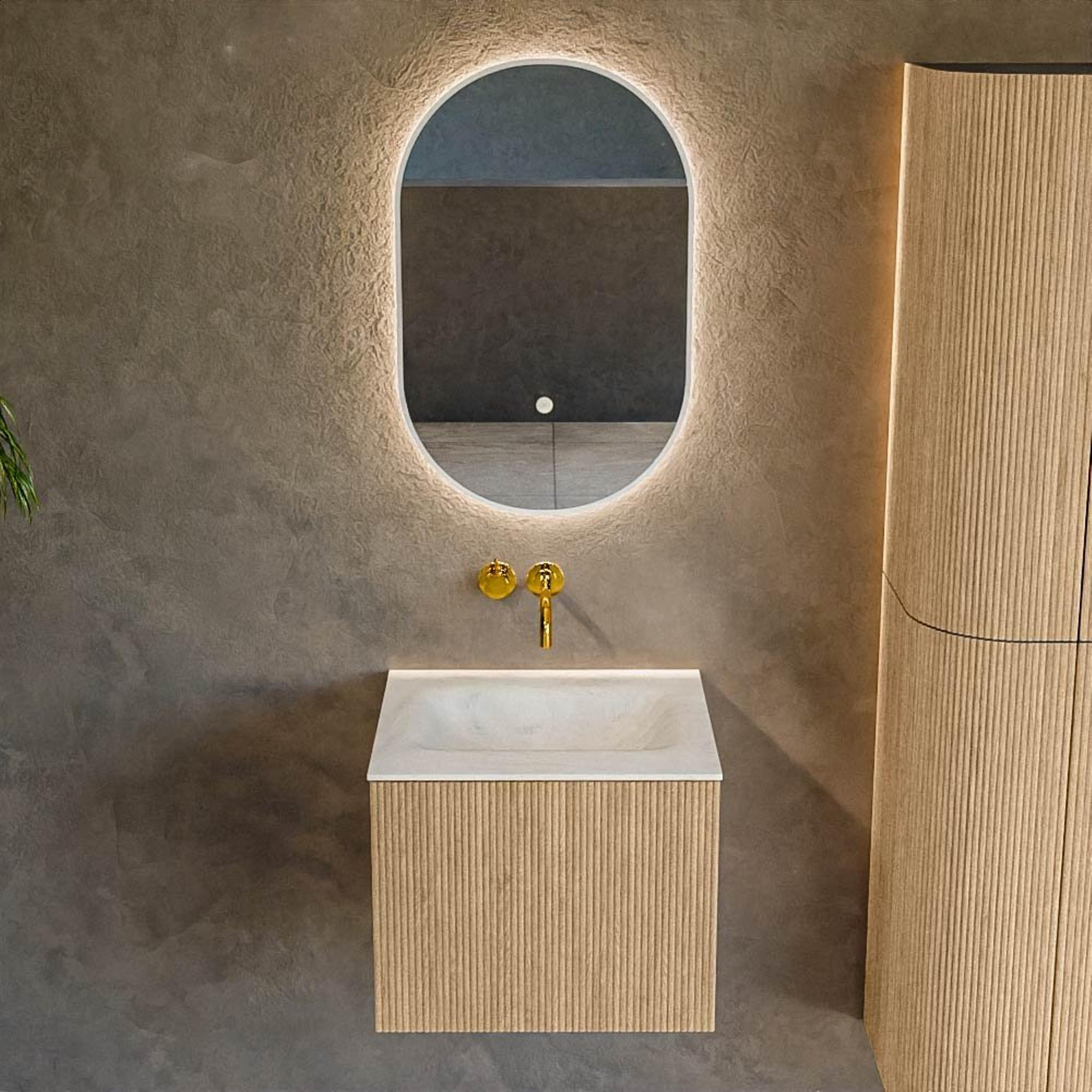 MONDIAZ KURVE-DLUX Meuble de salle de bains 50 cm couleur Oak avec 1 tiroir. Plan-vasque GRUNNE central sans trou de robinet couleur Opalo.