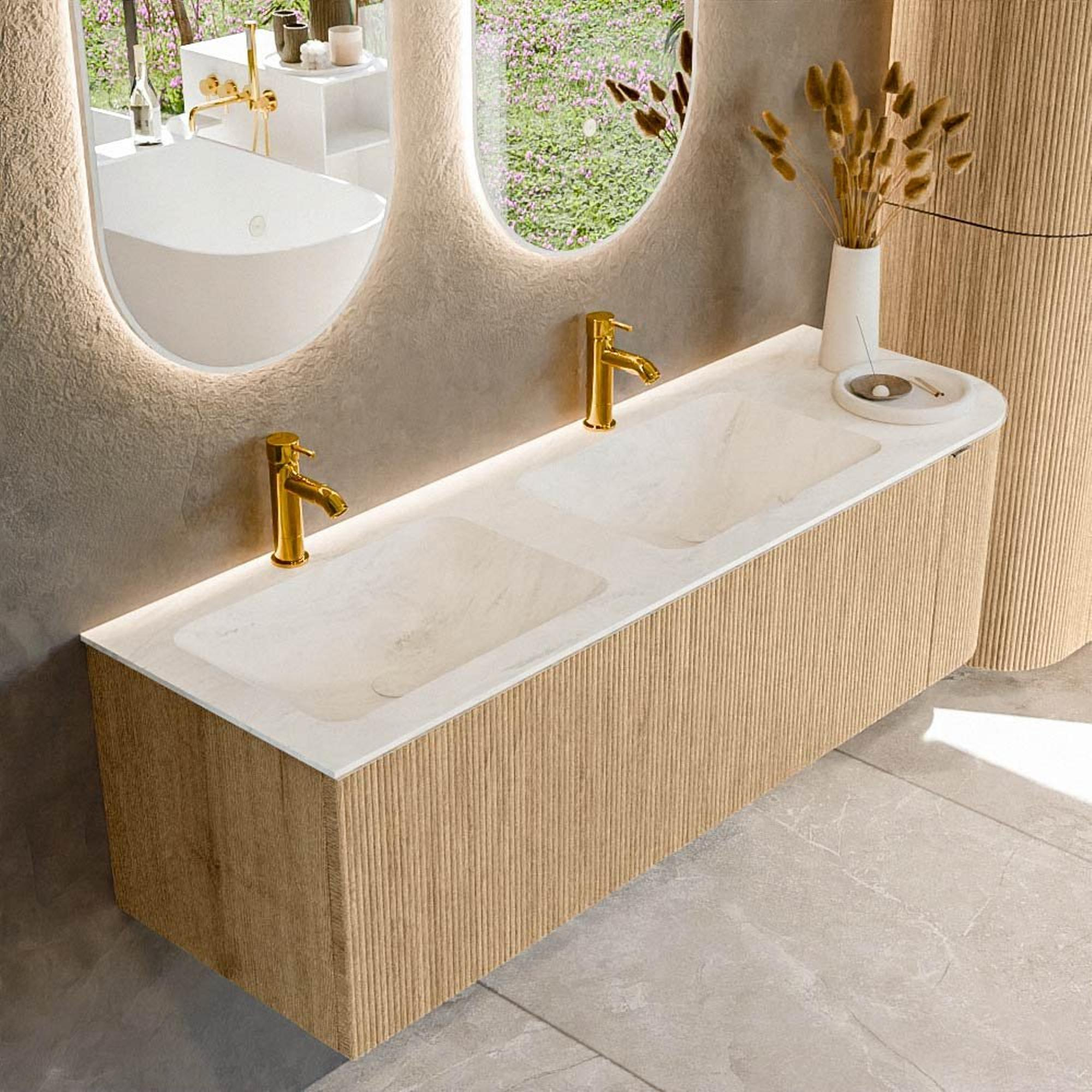 MONDIAZ KURVE-DLUX Meuble de salle de bains 145 cm avec module 25 R couleur Oak avec 1 tiroir et 1 porte. Lavabo LEAF double / gauche 2 trous de robinet couleur Opalo.