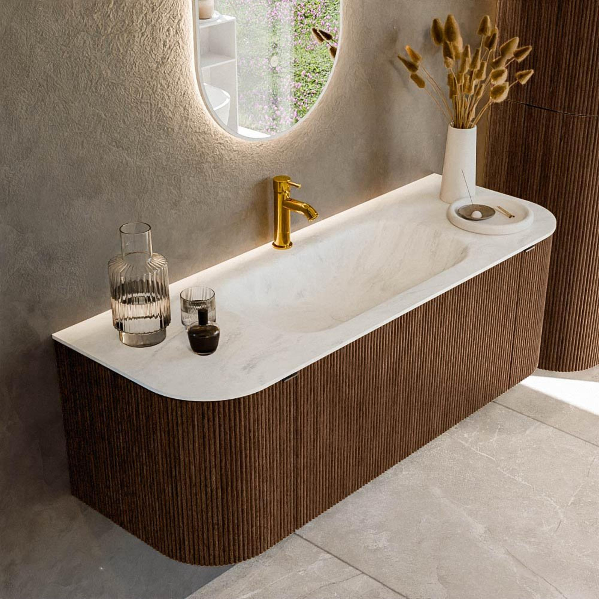 La forme rectangulaire avec angles arrondis assure une apparence élégante et chaleureuse qui apporte immédiatement du calme dans votre salle de bains. La teinte walnut chaude donne au meuble un aspect luxueux, presque comme un meuble de séjour, ce qui lui permet de s’harmoniser parfaitement avec un intérieur moderne ou une salle de bains riche en matériaux naturels. Le plan-vasque BIG SMALL blanc mat dans la couleur Opalo crée un contraste subtil et met encore plus en valeur les robinets et accessoires. Comme la vasque est positionnée au centre, l’ensemble paraît épuré et symétrique, ce qui contribue à une sensation d’ordre. Les poignées intégrées dans les façades rendent le design encore plus minimaliste : pas de poignées saillantes, mais de belles lignes fraisées qui soulignent le caractère de la série Kurve. Vous créez ainsi une base calme et haut de gamme dont vous profiterez pendant de nombreuses années.