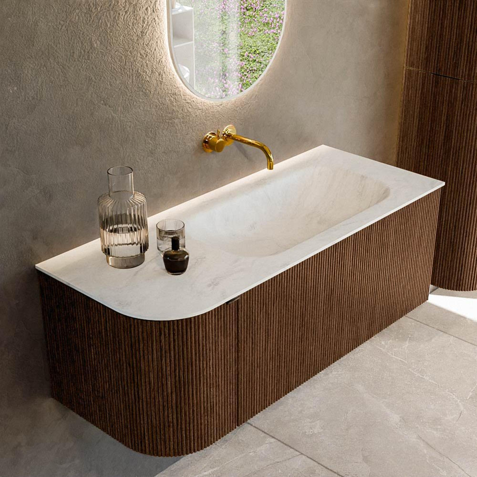 La couleur walnut du meuble donne immédiatement à votre salle de bains une atmosphère chaleureuse et naturelle, tandis que le plan-vasque blanc mat en couleur Opalo crée une base moderne et apaisante. La forme rectangulaire aux angles arrondis offre un rendu doux et élégant, permettant à l’ensemble de s’harmoniser subtilement avec les courbes de votre salle de bains. La poignée intégrée dans les façades en véritable bois assure un look minimaliste sans poignées saillantes, idéal si vous souhaitez créer un style épuré et ordonné. Vous obtenez ainsi une pièce maîtresse qui se marie sans effort avec des robinets et accessoires noirs, chromés ou en métal brossé.