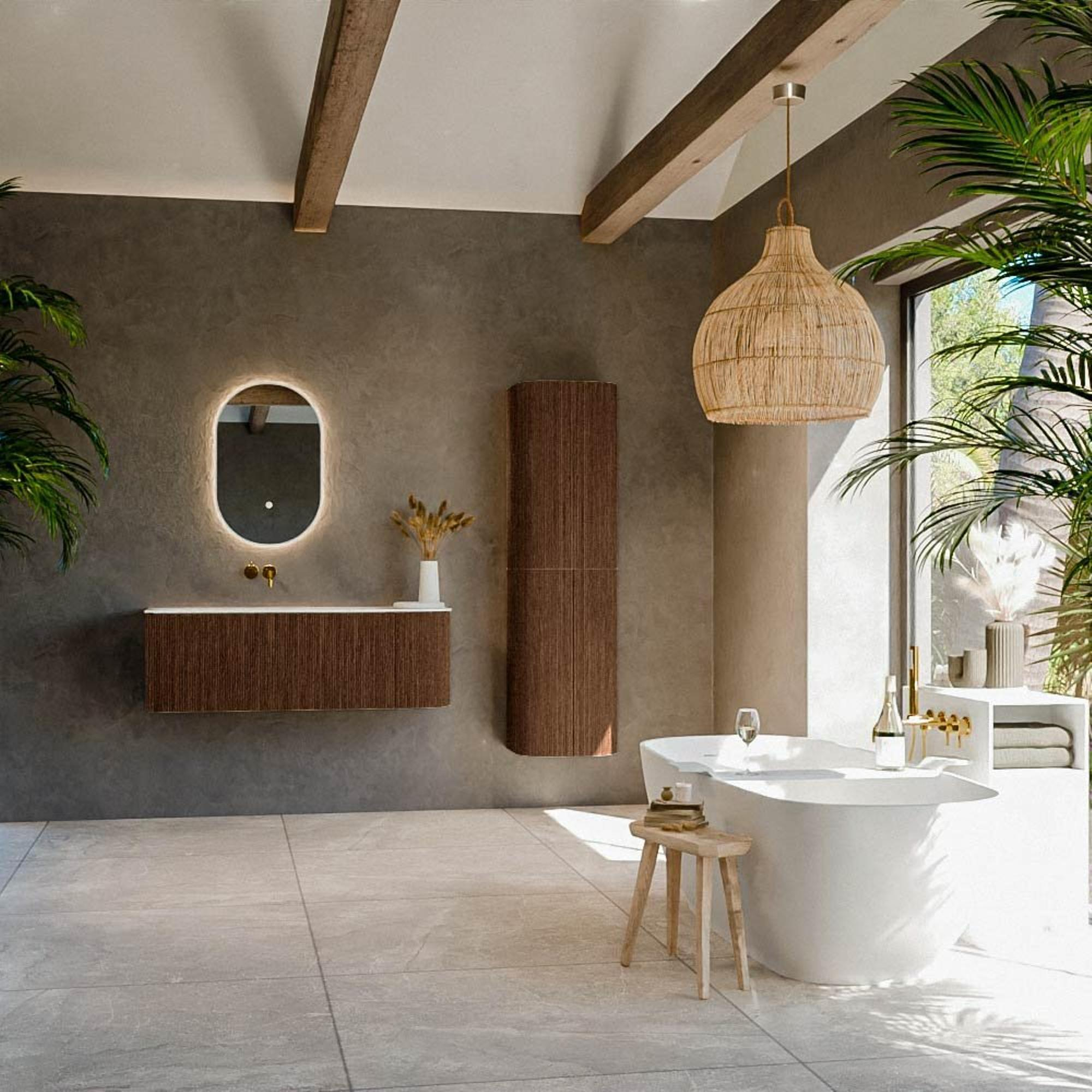 - Élégant décor bois walnut qui se marie parfaitement avec les styles de salle de bains naturels et modernes.