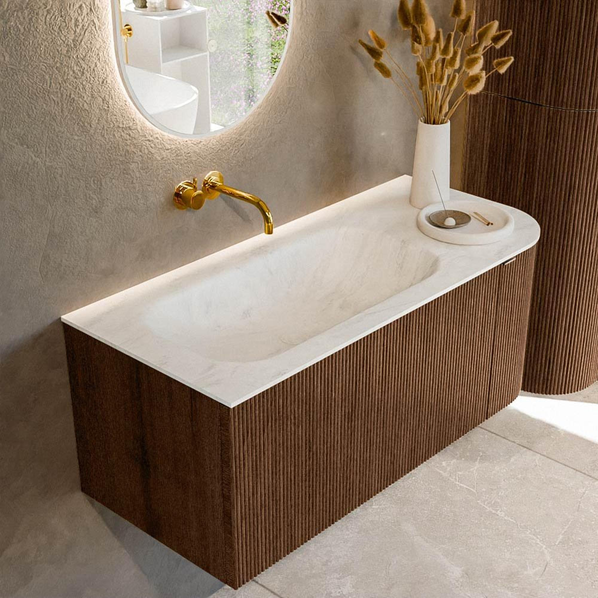 MONDIAZ KURVE-DLUX meuble de salle de bains 105 cm avec module 25 R couleur Walnut avec 1 tiroir et 1 porte. Lavabo BIG SMALL gauche sans trou de robinet couleur Opalo.
