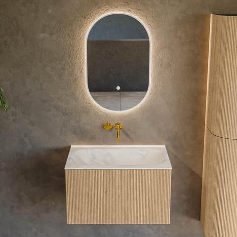 MONDIAZ KURVE-DLUX Meuble de salle de bains 70 cm couleur Oak avec 1 tiroir. Lavabo BIG SMALL central sans trou de robinet couleur Ostra.