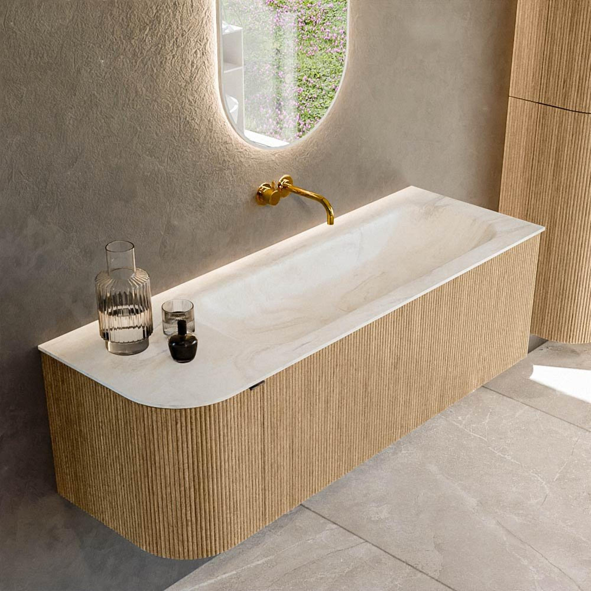 MONDIAZ KURVE-DLUX Meuble de salle de bains 135 cm avec module 25 L couleur Oak avec 1 tiroir et 1 porte. Lavabo BIG MEDIUM à droite sans trou de robinet couleur Ostra.