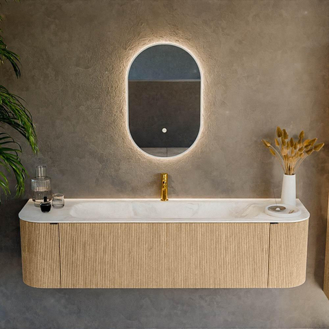 La forme rectangulaire aux coins arrondis donne à ce meuble une apparence douce et accueillante qui s'accorde parfaitement avec les salles de bains organiques et les intérieurs scandinaves. La teinte chêne chaleureuse du meuble contraste subtilement avec le lavabo crème en Ostra, faisant aussitôt de votre mur de lavabo un élément de luxe qui attire le regard. Les poignées intégrées assurent un look minimaliste sans poignées saillantes, ce qui paraît non seulement plus épuré, mais est aussi agréable à l'usage au quotidien. Grâce au montage flottant au mur, l'ensemble paraît léger et spacieux et le sol reste dégagé, ce qui donne l'impression que votre salle de bains est plus grande et facilite le nettoyage.