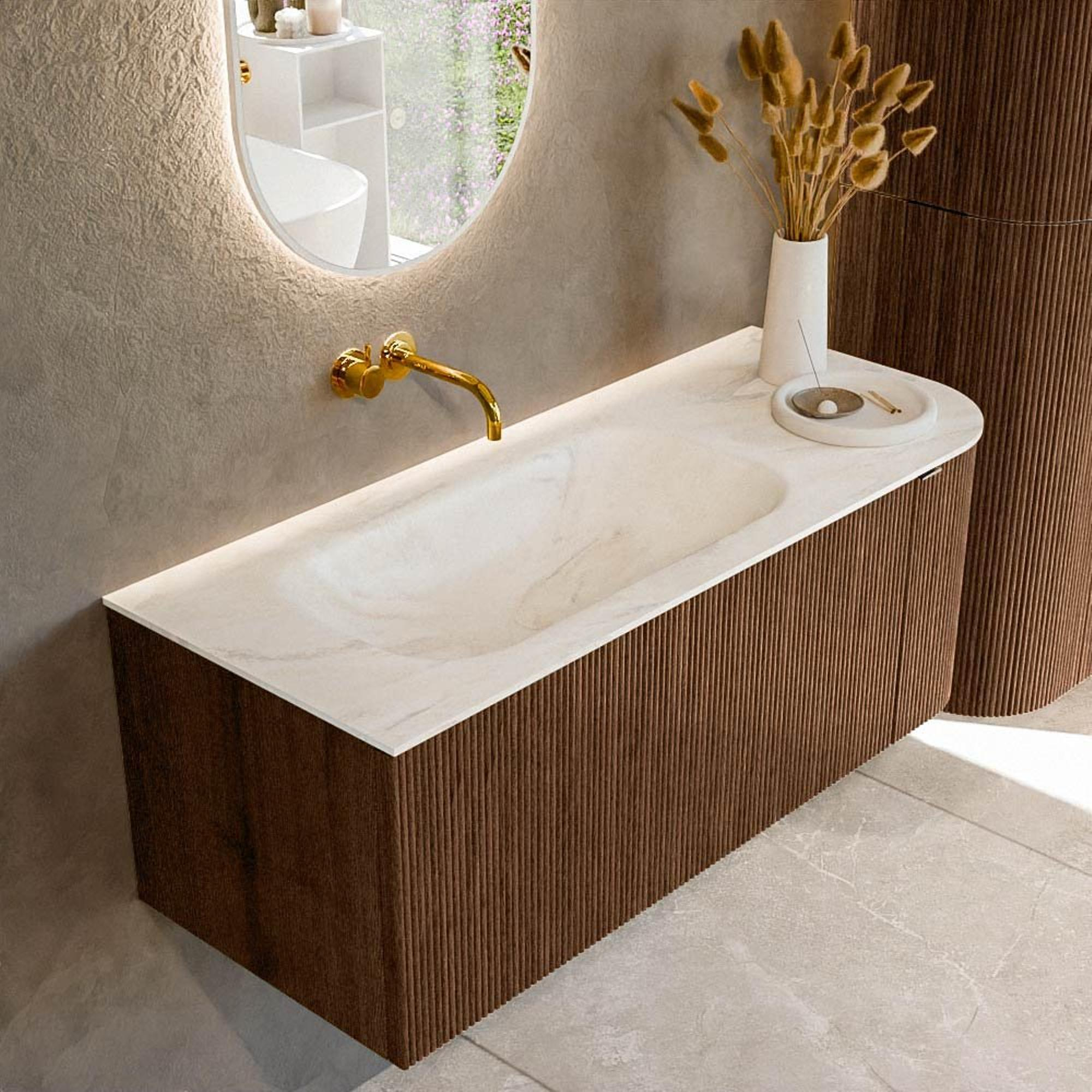 MONDIAZ KURVE-DLUX meuble de salle de bains 115 cm avec module 25 R couleur Walnut avec 1 tiroir et 1 porte. Lavabo BIG SMALL gauche sans trou de robinet couleur Ostra.