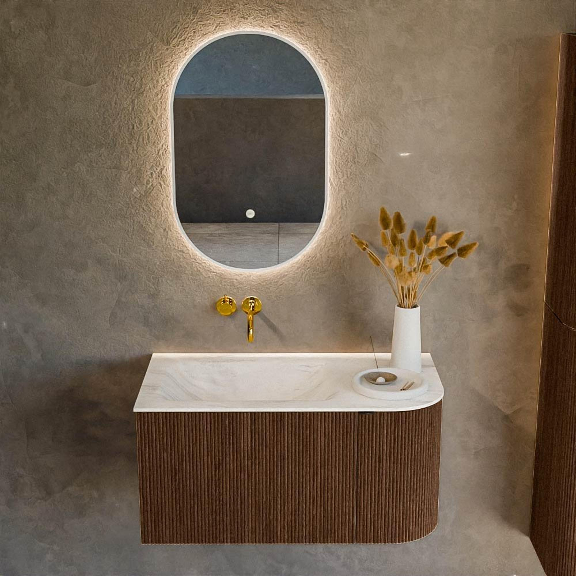 Le lavabo intégré en matériau solid surface offre de nombreux avantages au quotidien. Sa surface lisse et non poreuse est facile à nettoyer et, grâce à ses propriétés antibactériennes, plus hygiénique que de nombreux matériaux traditionnels. La saleté et les résidus de savon adhèrent moins rapidement, ce qui vous permet de garder le lavabo beau sans effort avec un chiffon doux et un nettoyant doux. La teinte crème Ostra apporte une apparence douce et luxueuse et forme un contraste subtil avec le meuble bas couleur walnut. Comme le lavabo ne possède pas de trou de robinet, vous êtes entièrement libre de choisir un mitigeur posé ou encastré, par exemple dans le mur. Cela confère un look encore plus épuré et design et fait de ce meuble une base parfaite pour une salle de bains contemporaine à la finition haut de gamme.