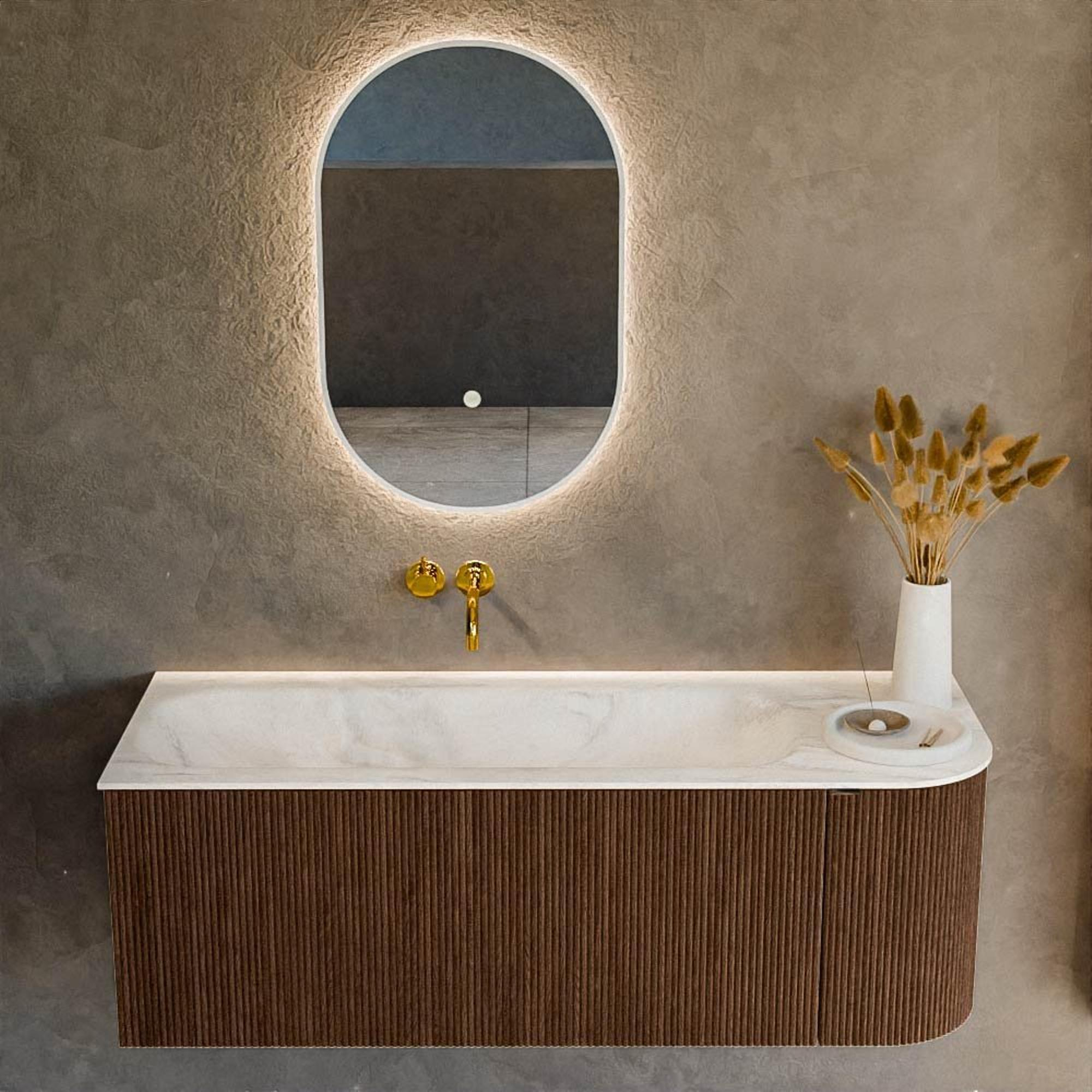 La couleur walnut et la forme rectangulaire aux coins arrondis donnent à ce meuble une apparence douce et accueillante qui correspond parfaitement aux tendances actuelles de la salle de bains. La combinaison du décor bois avec le plan sobre de couleur Ostra crée un aspect haut de gamme, presque comme un véritable meuble, qui fait immédiatement monter votre salle de bains en gamme. La poignée intégrée dans le tiroir et la porte conserve une façade épurée et minimaliste, sans poignées saillantes qui interrompent les lignes. Grâce aux courbes subtiles, l’ensemble paraît moins rigide que les meubles entièrement droits, ce qui est idéal si vous souhaitez créer une atmosphère chaleureuse et invitante. Vous apportez ainsi la sensation d’une suite d’hôtel luxueuse dans votre propre salle de bains, mais entièrement adaptée à un usage quotidien.