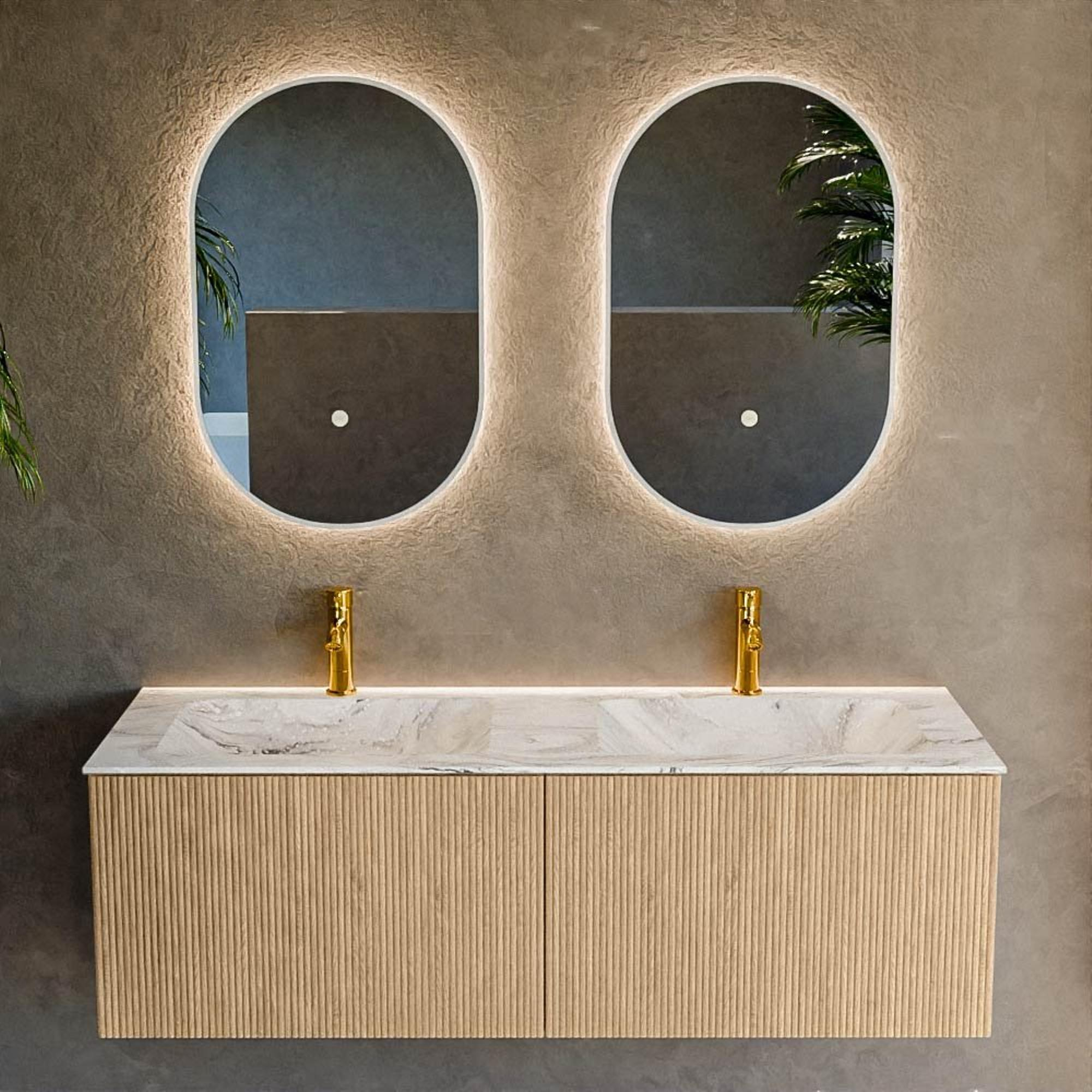 MONDIAZ KURVE-DLUX 130cm Meuble salle de bain - couleur Oak - 2 tiroirs - vasque LEAF double - 2 trous de robinet - couleur Glace