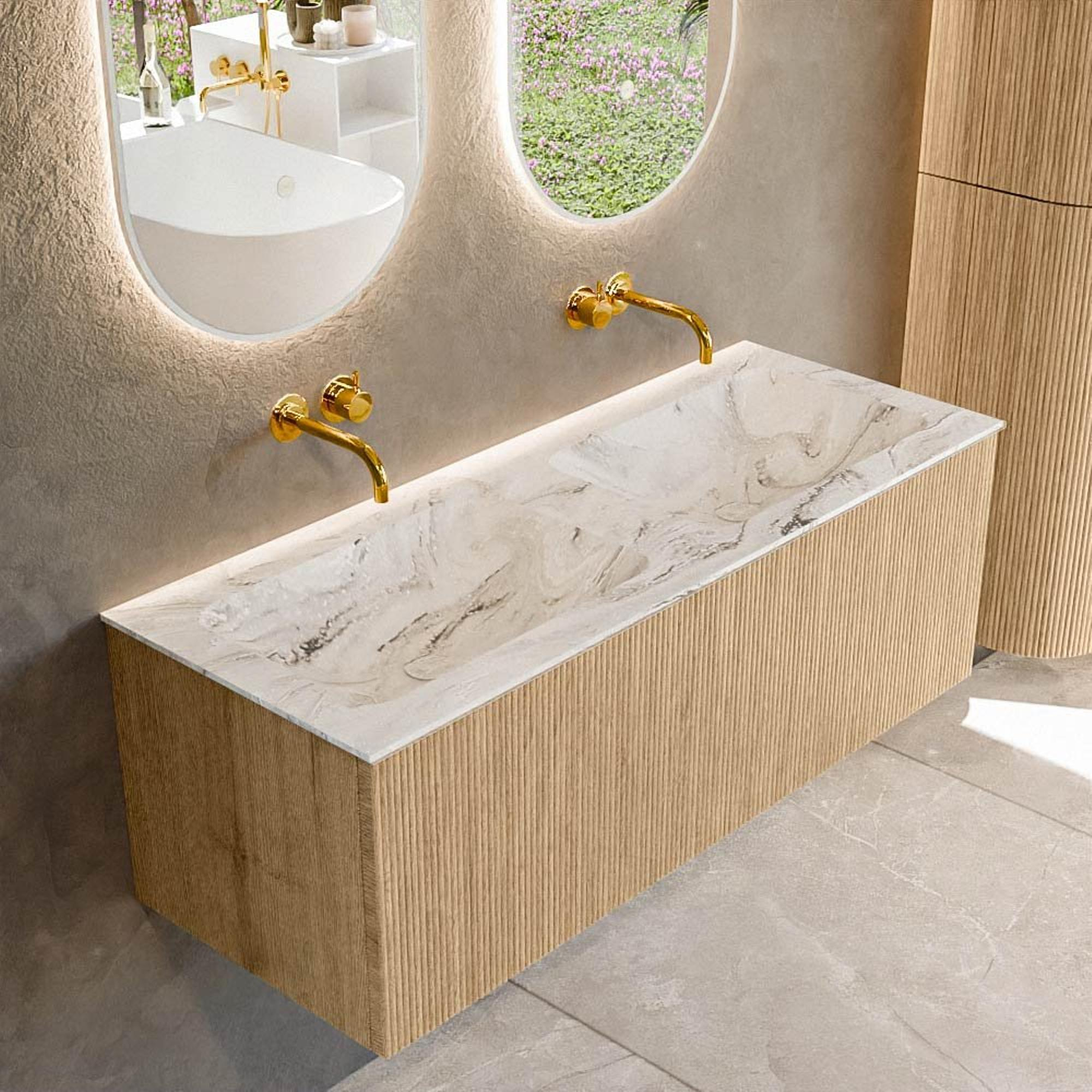 MONDIAZ KURVE-DLUX meuble de salle de bains 120 cm couleur Oak avec 1 tiroir. Lavabo LEAF double sans trou de robinet couleur Glace.