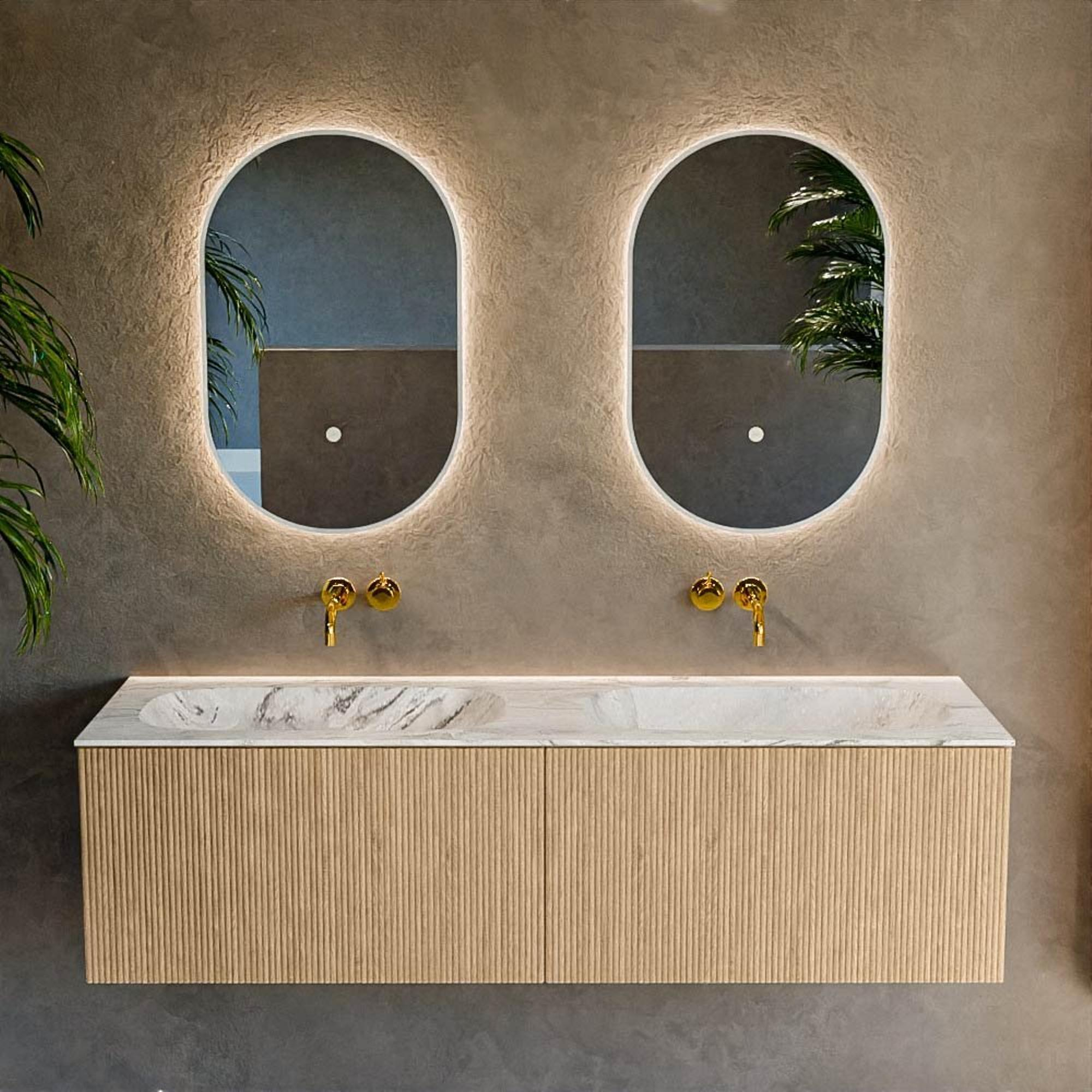 Avec une largeur de 150 cm et une profondeur compacte de 46 cm, ce meuble de salle de bains offre un grand confort d’utilisation sans paraître massif. La double vasque de couleur beige Glace vous offre le luxe d’être à deux devant le miroir en même temps, idéal dans un foyer animé ou si vous aimez disposer de plus d’espace pendant votre routine du matin et du soir. Comme le plan vasque ne comporte pas de trous de robinet, vous pouvez choisir vous-même de beaux mitigeurs surélevés et des solutions encastrées assorties, afin d’adapter entièrement le style de votre salle de bains à vos souhaits. La forme rectangulaire s’intègre parfaitement dans un intérieur moderne, tandis que les lignes douces des cuves et la surface claire rendent l’ensemble chaleureux et accueillant. Vous associez ainsi un design épuré à un confort quotidien.