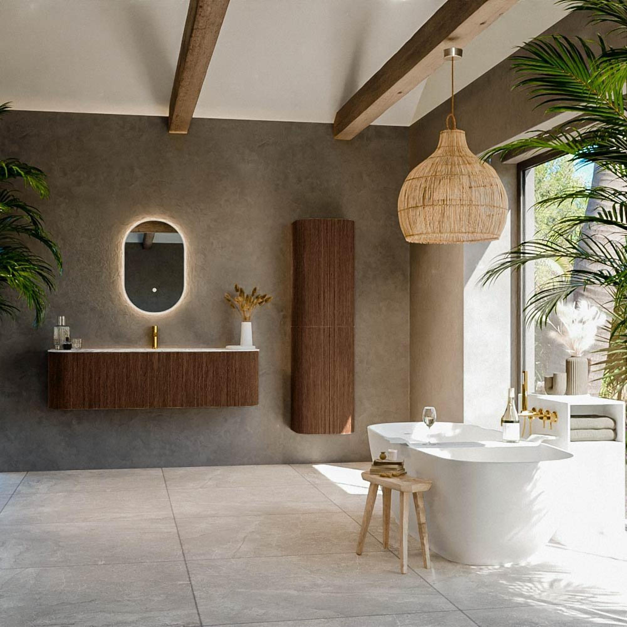La forme rectangulaire avec angles arrondis donne à ce meuble un look distinctif : épuré et moderne, mais sans lignes dures. La teinte walnut chaleureuse et la structure bois créent immédiatement une ambiance agréable et facilitent la combinaison aussi bien avec des carreaux clairs qu’avec des accents foncés. Les poignées intégrées renforcent le caractère minimaliste : pas de poignées saillantes qui interrompent la ligne, mais une façade épurée qui reste cependant confortable à ouvrir. Le lavabo placé au centre, de couleur Glace, s’y raccorde parfaitement ; le beige doux a un aspect chic et sobre et forme un beau contraste avec le bois. Il en résulte un ensemble raffiné qui donne à votre salle de bains le caractère d’un hôtel de luxe, sans que cela ne devienne trop chargé ou tape-à-l’œil.