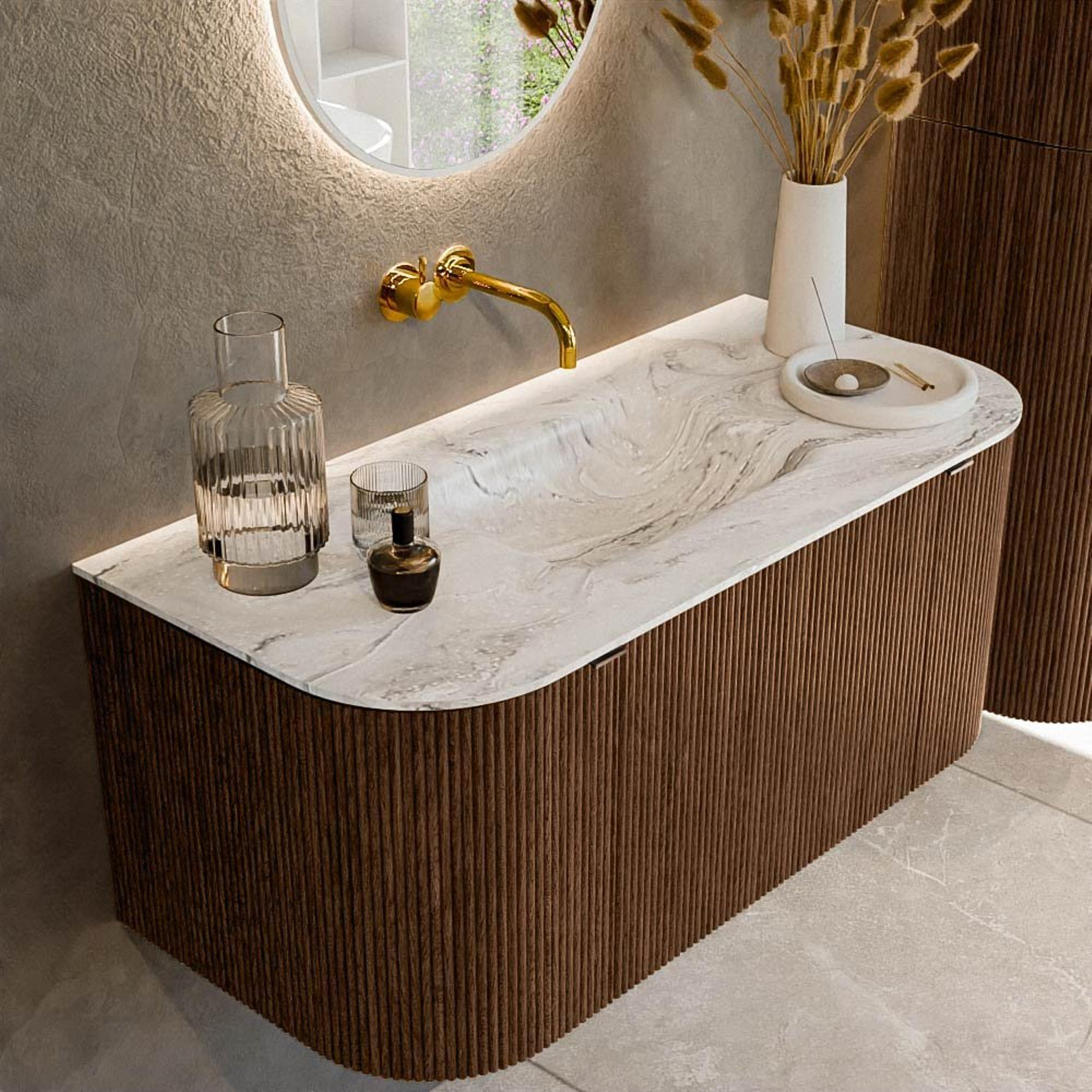 La forme rectangulaire aux angles arrondis crée une belle tension entre lignes droites et douceur. Les courbes à l’avant et sur les côtés donnent au meuble une apparence accueillante, presque organique, qui s’intègre parfaitement dans des salles de bains de style scandinave, hôtel chic ou design moderne. Dans le même temps, la forme reste suffisamment sobre pour bien se marier avec des carreaux droits, un miroir minimaliste ou une douche encastrée. Le montage mural met l’accent sur la ligne horizontale de 100 cm de large, ce qui donne à votre salle de bains une impression de largeur. Ainsi, avec un seul meuble, vous ajoutez non seulement de la fonctionnalité, mais vous renforcez également l’esthétique globale de la pièce.