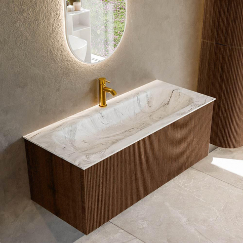 MONDIAZ KURVE-DLUX Meuble de salle de bains 110 cm couleur Walnut avec 1 tiroir. Lavabo BIG MEDIUM central 1 trou de robinet couleur Glace.