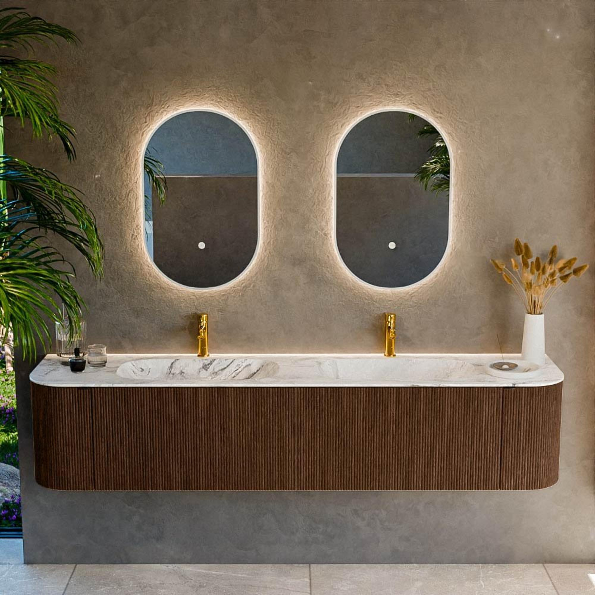 Vous recherchez un meuble de salle de bains spacieux qui combine suffisamment d’espace de rangement avec une apparence chaleureuse et luxueuse ? Alors ce meuble suspendu au mur est un choix judicieux. Avec sa largeur généreuse de 200 cm, sa double vasque et ses deux trous de robinet, il est idéal pour un foyer animé, un couple qui aime commencer la journée en même temps ou une salle de bains familiale où fonctionnalité et style se rejoignent. La couleur bois élégante en walnut et les formes arrondies donnent immédiatement un aspect raffiné à toute salle de bains moderne, design ou style hôtel chic. Parallèlement, l’ensemble reste pratique à utiliser au quotidien grâce à l’agencement bien pensé avec tiroirs et portes. Grâce à la combinaison d’un lavabo beige doux et de façades aspect bois, on obtient un mélange intemporel que vous pouvez facilement associer à une grande variété de carreaux, de robinets et d’accessoires.