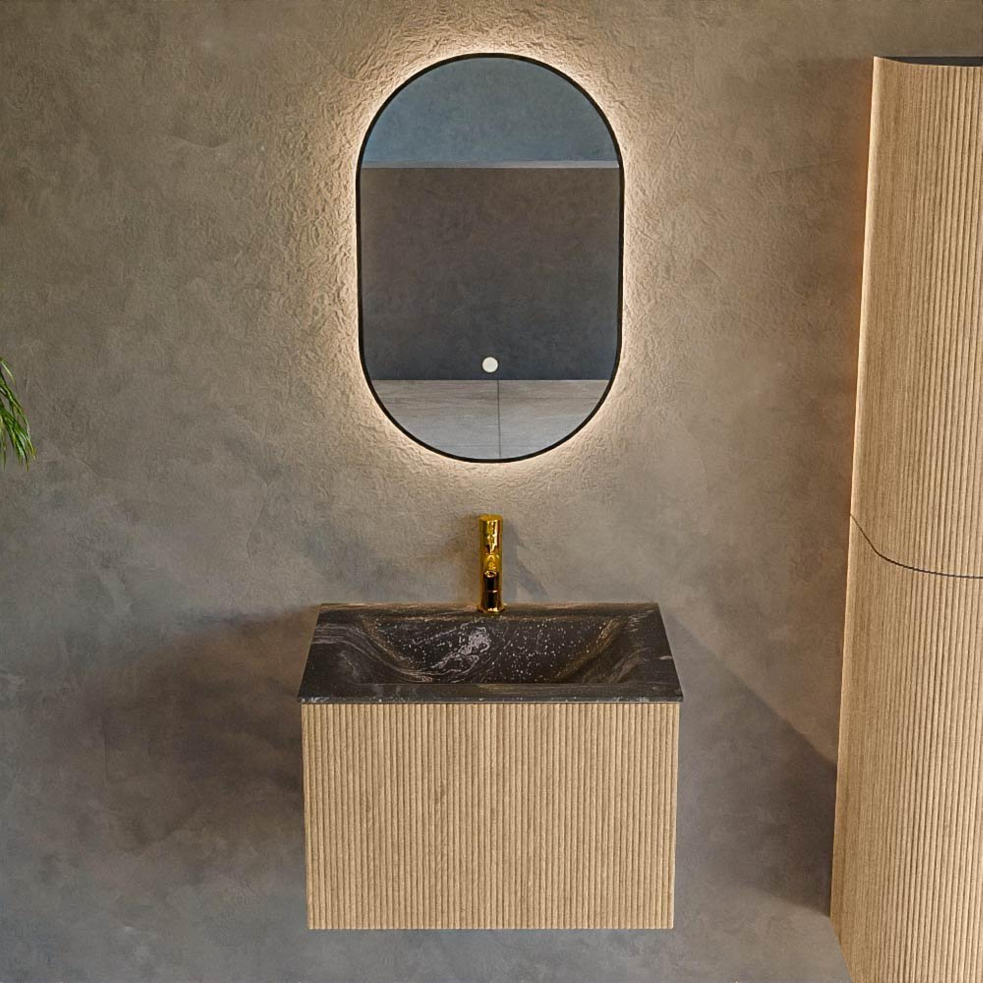 La teinte chaleureuse Oak du meuble forme un contraste élégant avec le lavabo lave anthracite. Cette combinaison est moderne, chic et pourtant naturelle, ce qui vous permet de créer facilement une atmosphère de spa luxueuse à la maison. Le lavabo anthracite au design Cloud offre un look contemporain, presque flottant, qui se marie parfaitement avec des robinets noirs, chromés ou en métal brossé. Grâce à la poignée intégrée dans la façade, l’apparence reste calme et minimaliste, sans poignées saillantes qui interrompent le jeu de lignes. La teinte bois s’accorde parfaitement avec d’autres matériaux naturels, tels que des accessoires en bois, des carreaux beiges ou un effet béton, de sorte que vous transformez facilement votre salle de bains en un ensemble harmonieux et élégant. Vous ne choisissez donc pas seulement un meuble de salle de bains pratique, mais aussi une véritable déclaration de style.