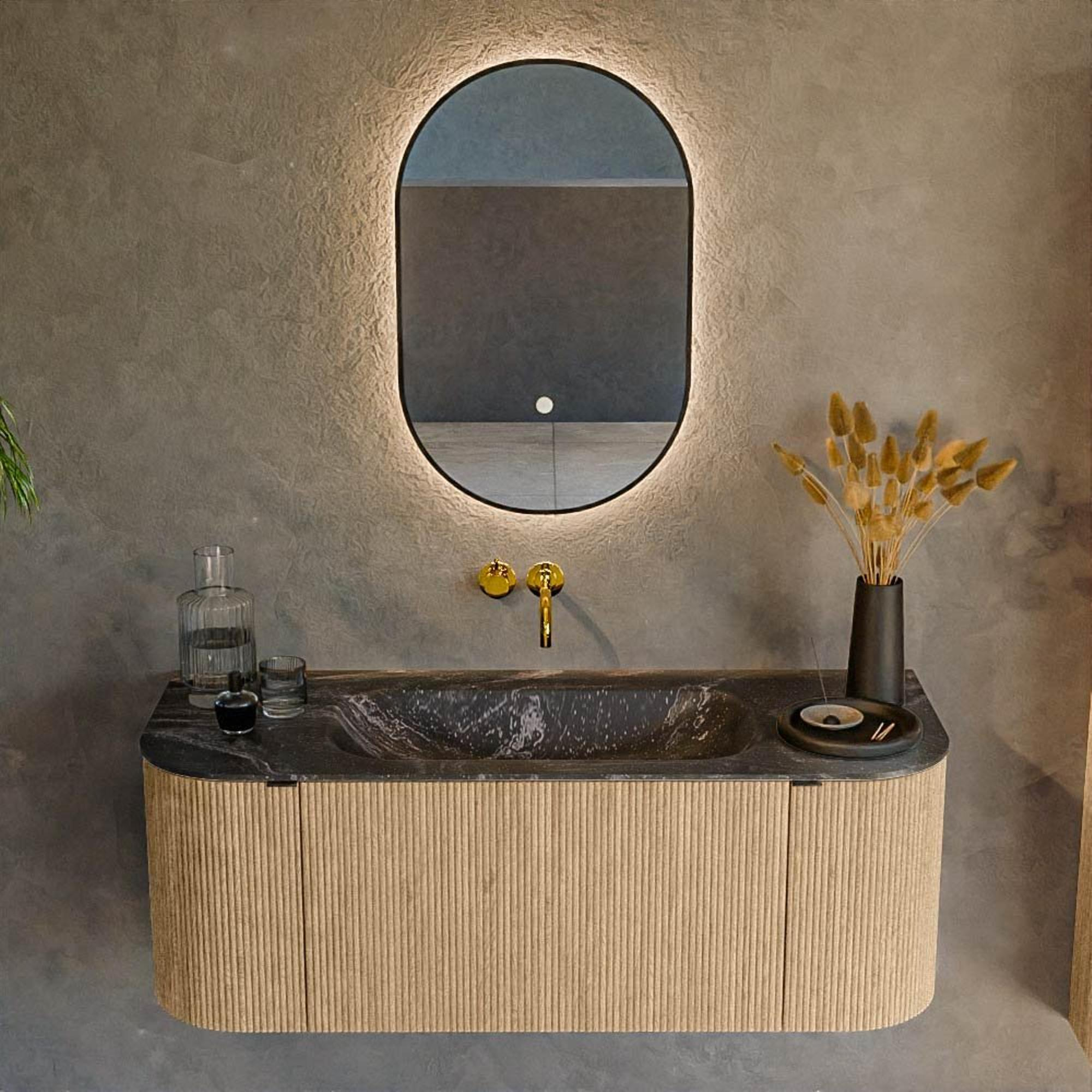 - Meuble couleur Oak chaleureux combiné à un lavabo couleur Lava pour une apparence moderne et luxueuse.