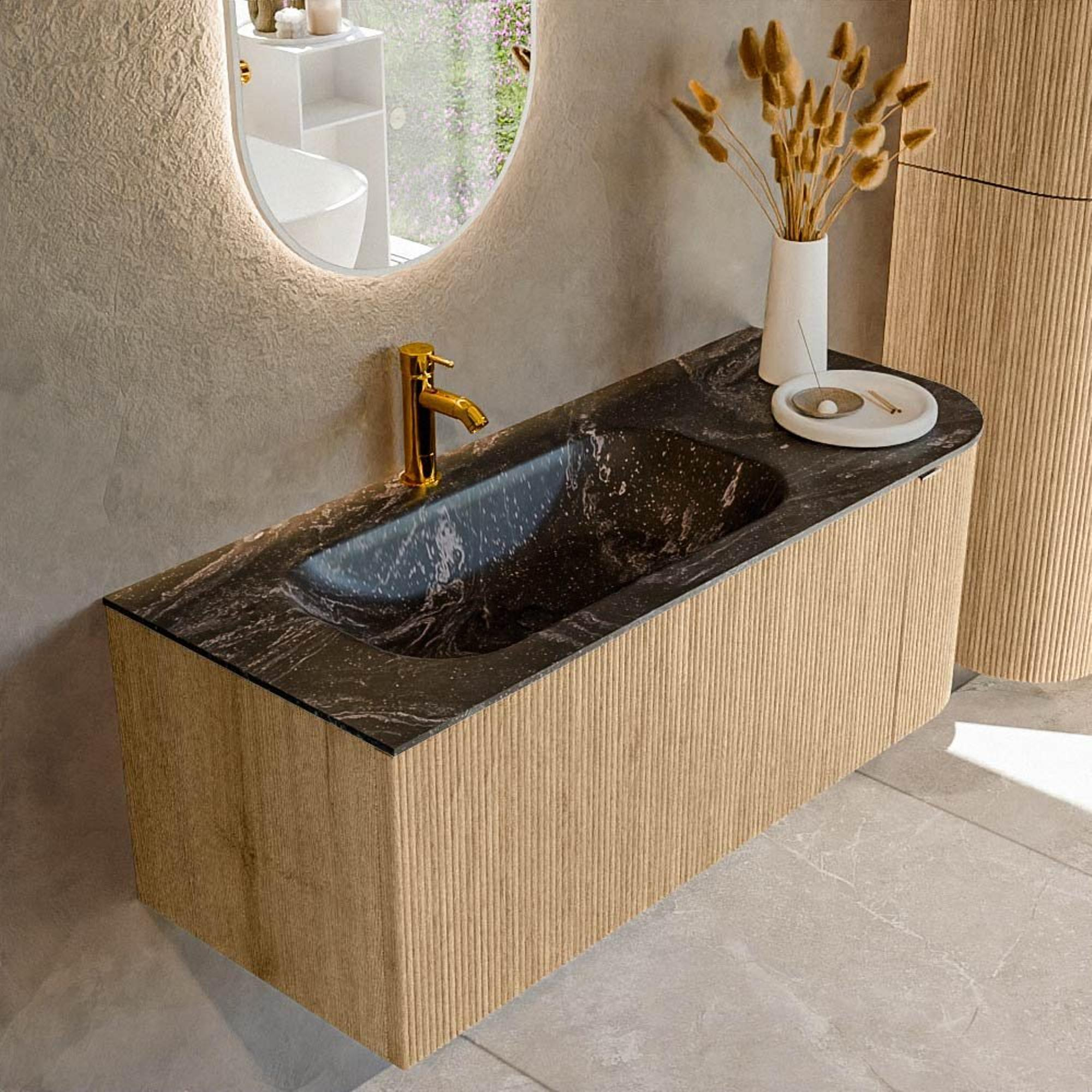 - Lavabo Lava en anthracite pour un contraste élégant avec le meuble Oak et une apparence luxueuse.