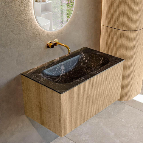 MONDIAZ KURVE-DLUX Meuble de salle de bains 80cm couleur Oak avec 1 tiroir. Lavabo BIG SMALL central sans trou de robinetterie couleur Lava.