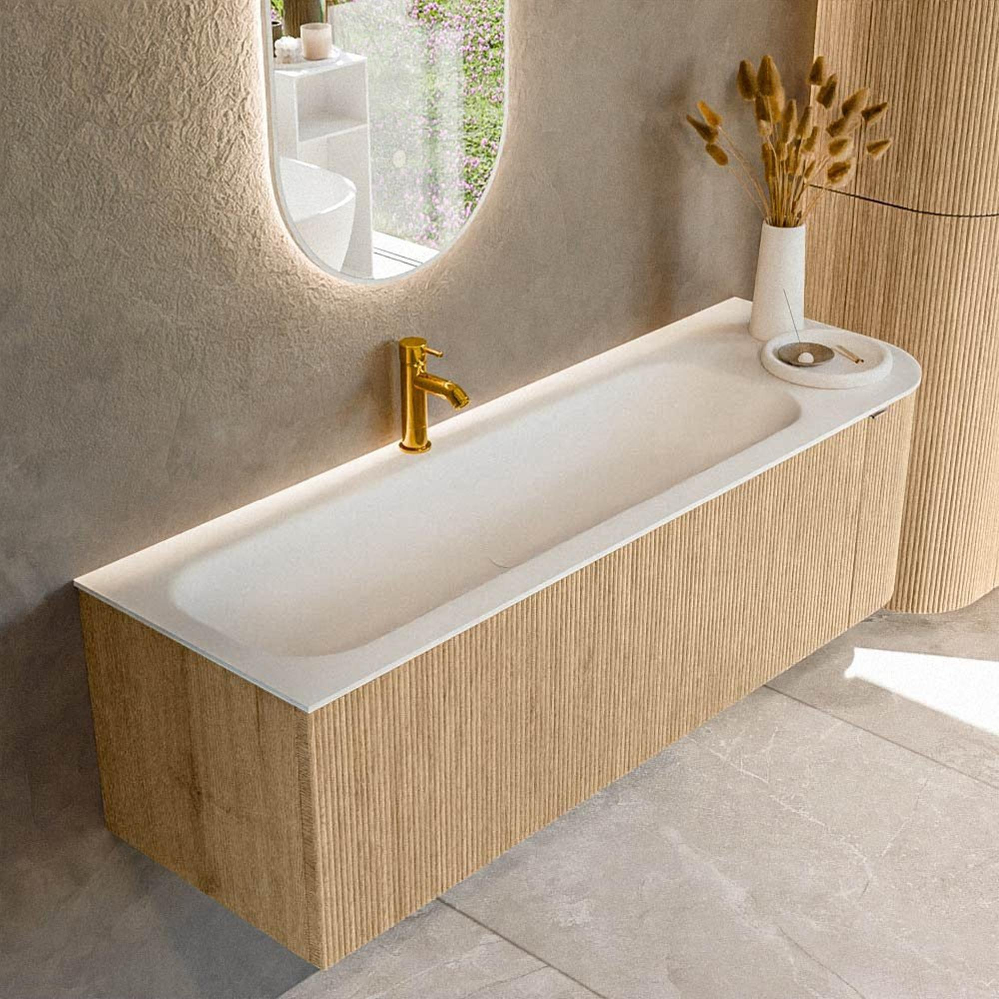 La forme rectangulaire avec coins arrondis et les lignes verticales dans les façades en bois confèrent à ce meuble une apparence raffinée et douce. La couleur Oak mate paraît chaleureuse et naturelle, sans être criarde, ce qui donne immédiatement à votre salle de bains un caractère calme et luxueux. Le lavabo blanc mat dans la couleur Talc crée un contraste élégant avec le bois et s’accorde parfaitement avec les tendances actuelles des salles de bains modernes. Grâce à l’installation suspendue (fixée au mur), le meuble paraît léger et aéré, ce qui offre un très bel effet surtout dans les salles de bains de taille moyenne à grande. Avec une unique poignée intégrée discrète dans le tiroir et la porte, la façade reste sobre et minimaliste, idéale si vous aimez un ensemble ordonné et architectural.