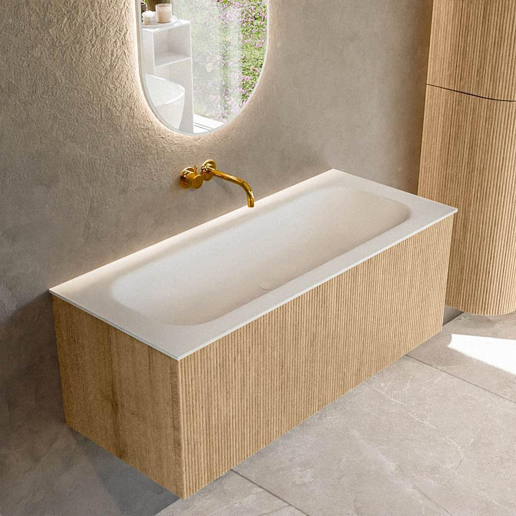 MONDIAZ KURVE 110cm Meuble salle de bain - couleur Oak - 1 tiroir - vasque BIG MEDIUM centre - sans trous de robinet - Talc