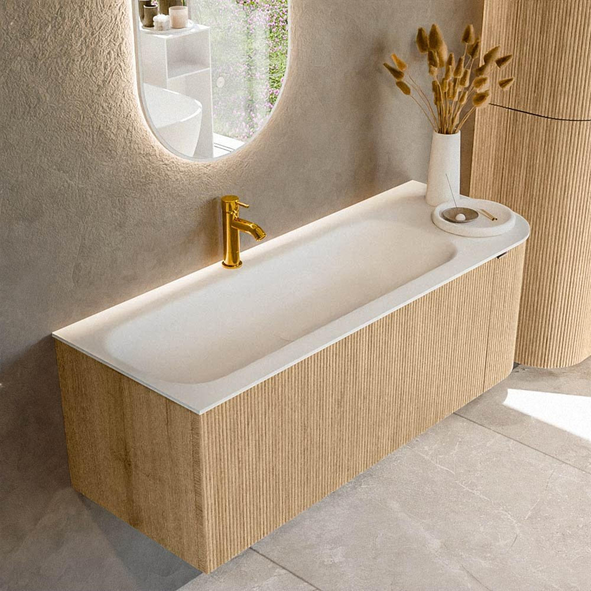 La combinaison de la couleur bois mate Oak et du lavabo blanc mat en couleur Talc confère à ce meuble une allure élégante et contemporaine. La forme rectangulaire aux angles arrondis adoucit subtilement les lignes épurées, de sorte que l'ensemble paraît accueillant tout en restant moderne. L'aspect sans poignées avec poignée intégrée contribue à un design minimaliste qui s'intègre parfaitement dans une salle de bains moderne ou design. Comme la façade et la gamme de couleurs présentent clairement un aspect bois, vous apportez de la chaleur et de l'ambiance sans renoncer à une forme épurée. La finition mate évite les reflets gênants de la lumière et est en outre plus indulgente pour les traces de doigts, afin que votre salle de bains conserve plus longtemps un aspect soigné.