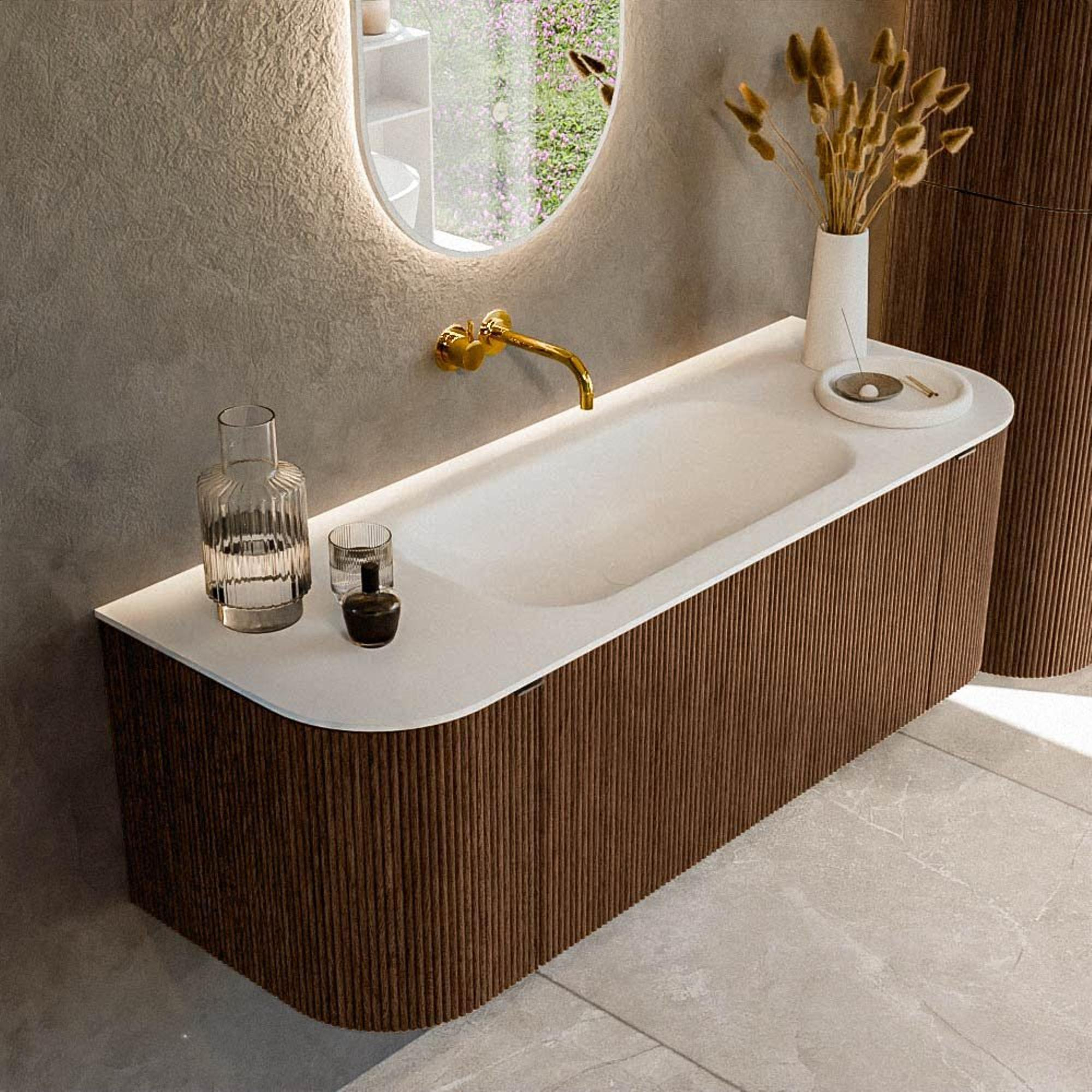MONDIAZ KURVE 130cm Meuble salle de bain avec module 25 G et D - couleur Walnut - 1 tiroir - 2 portes - vasque BIG SMALL centre - sans trous de robinet - Talc