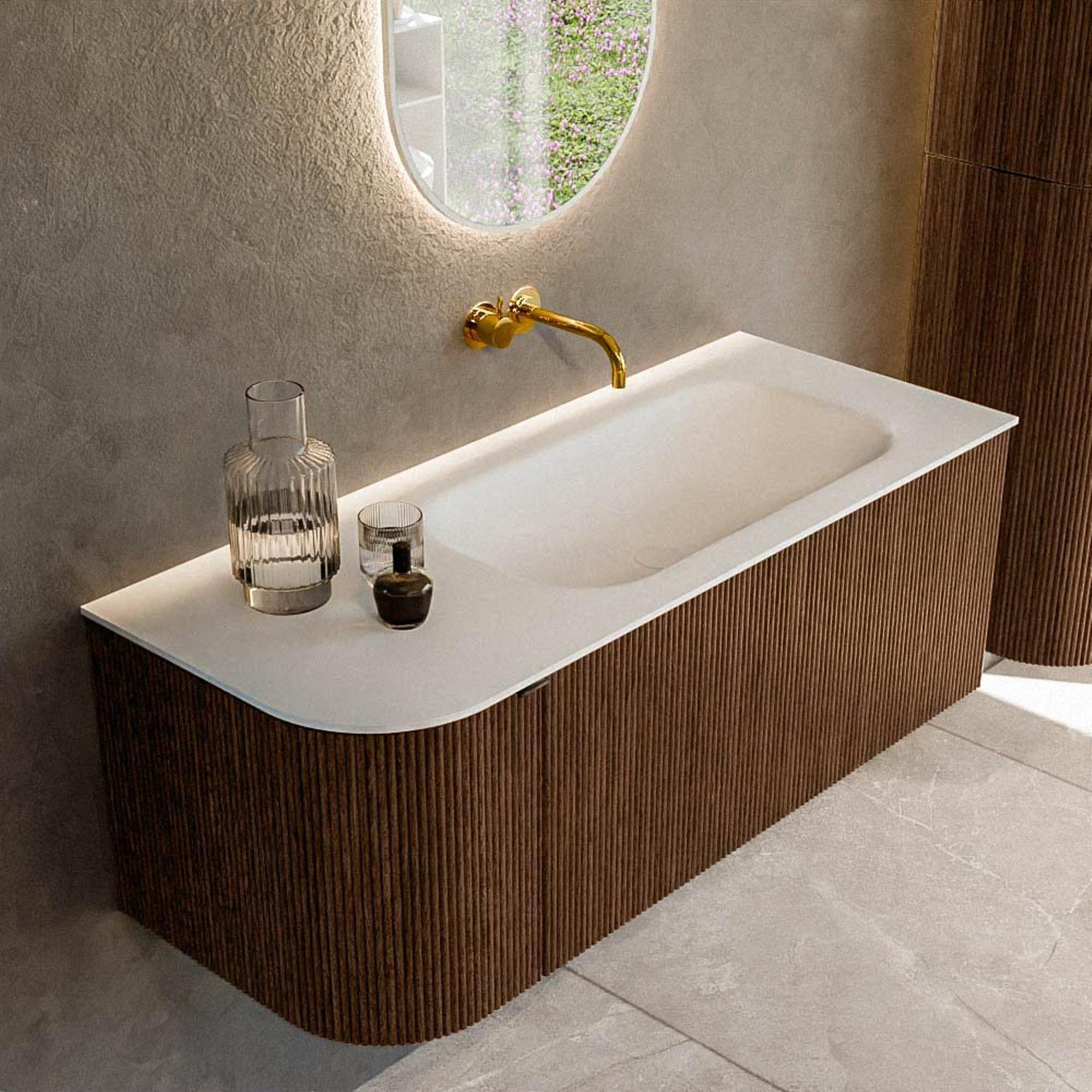 La forme rectangulaire aux angles arrondis confère à ce meuble un caractère chaleureux et luxueux. Les façades couleur noyer avec finition mate apportent immédiatement de la chaleur à la pièce, de sorte que votre salle de bains paraît moins clinique et davantage comme un espace bien-être plein d’ambiance. La poignée intégrée est subtilement incorporée dans les façades, ce qui vous permet de profiter d’un effet épuré et sans poignées sans compromis sur la facilité d’utilisation. Le plan vasque blanc mat dans la couleur Talc s’accorde harmonieusement avec la teinte bois naturelle et crée un ensemble apaisant, facile à combiner avec des robinetteries et accessoires noirs, chromés ou en métal brossé. Vous créez ainsi d’un seul coup un look cohérent qui convient aussi bien aux salles de bains modernes que scandinaves ou de style hôtel chic.