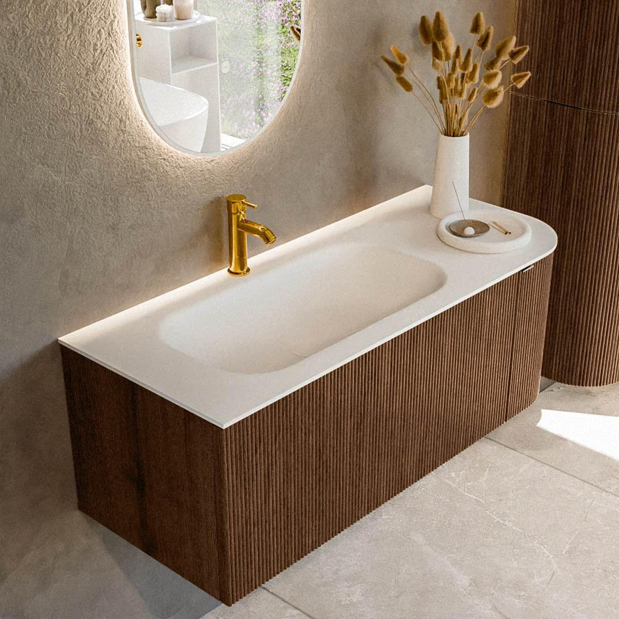 MONDIAZ KURVE Meuble de salle de bains 115cm avec module 25 R couleur Walnut avec 1 tiroir et 1 porte. Lavabo BIG SMALL gauche 1 trou de robinet Talc.