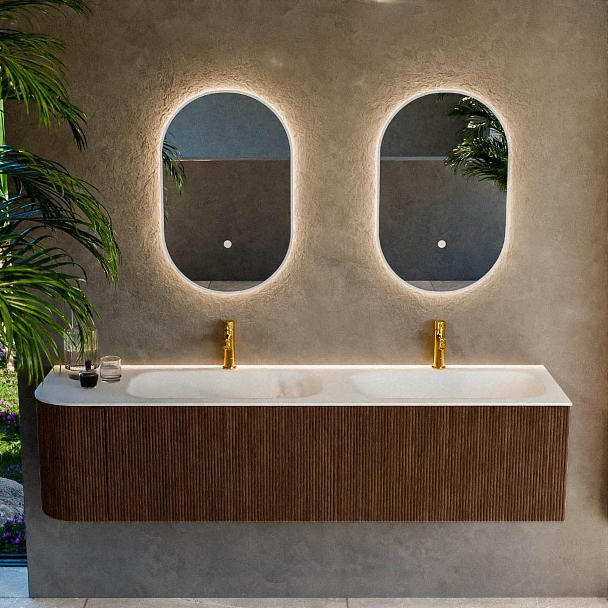 La configuration de lavabo BIG SMALL avec deux bassins et deux trous de robinet rend ce meuble particulièrement adapté aux foyers où l’heure de pointe du matin peut être parfois chargée. Vous pouvez être à deux en même temps pour vous brosser les dents ou vous préparer, sans vous gêner mutuellement. L’association du lavabo blanc mat et du décor walnut chaleureux offre une apparence contemporaine et luxueuse qui s’intègre parfaitement dans les salles de bains modernes et d’inspiration hôtel chic. La forme rectangulaire aux angles arrondis a un aspect doux et accueillant, ce qui rend l’ensemble moins anguleux et massif tout en utilisant de manière optimale la largeur disponible. Grâce au montage mural, le meuble semble flotter, ce qui crée un effet d’espace et se marie parfaitement avec des douches à l’italienne ou de grands carreaux de sol.