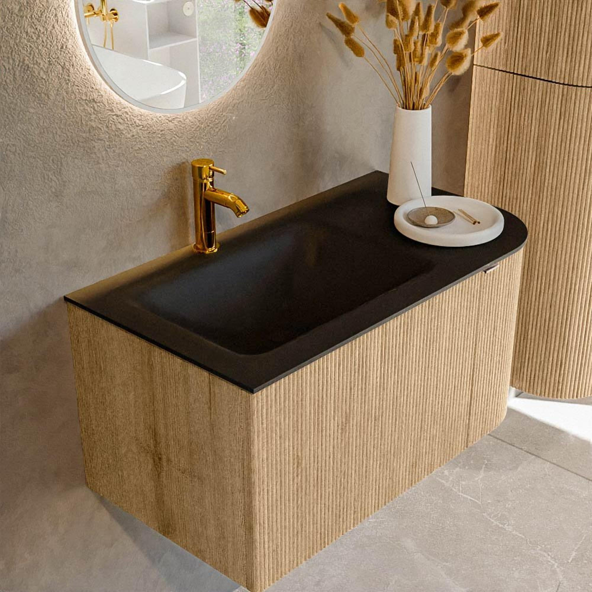 La combinaison d’une façade en chêne mat avec un lavabo noir mat crée un contraste dynamique qui donne immédiatement à votre salle de bains une apparence haut de gamme. Les angles arrondis adoucissent l’ensemble et permettent à la forme de s’harmoniser avec le reste de votre intérieur, surtout si vous utilisez également des miroirs ronds ou des lignes douces dans votre douche ou vos accessoires. Grâce aux poignées intégrées, la façade reste sobre et minimaliste ; pas de poignées saillantes qui rompent le jeu de lignes ou auxquelles vous pourriez vous accrocher. La partie vasque Urban noire est à la fois moderne et intemporelle, de sorte que vous pouvez facilement combiner ce meuble avec des robinets noirs, en inox ou même en laiton. En optant pour ce style, vous faites entrer chez vous un véritable élément phare qui reste pourtant calme et équilibré.