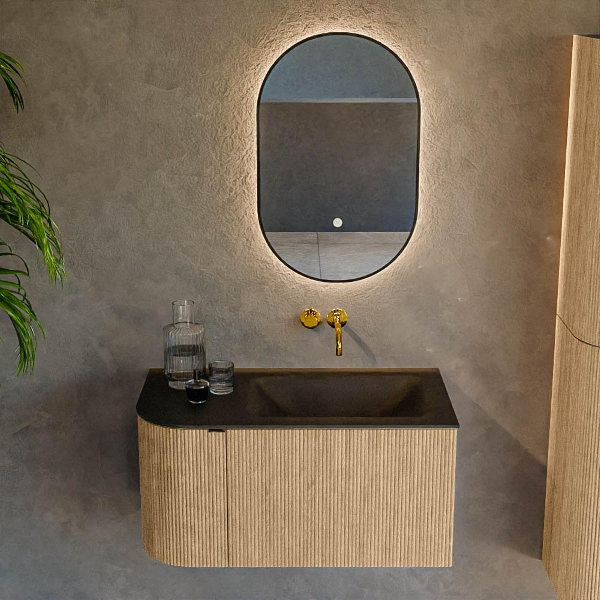 MONDIAZ KURVE 85cm Meuble salle de bain avec module 25 G - couleur Oak - 1 tiroir - 1 porte - vasque CLOUD droite - sans trous de robinet - Urban