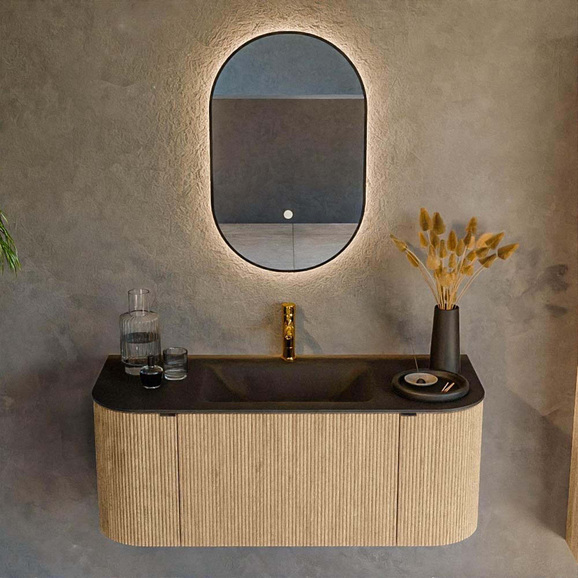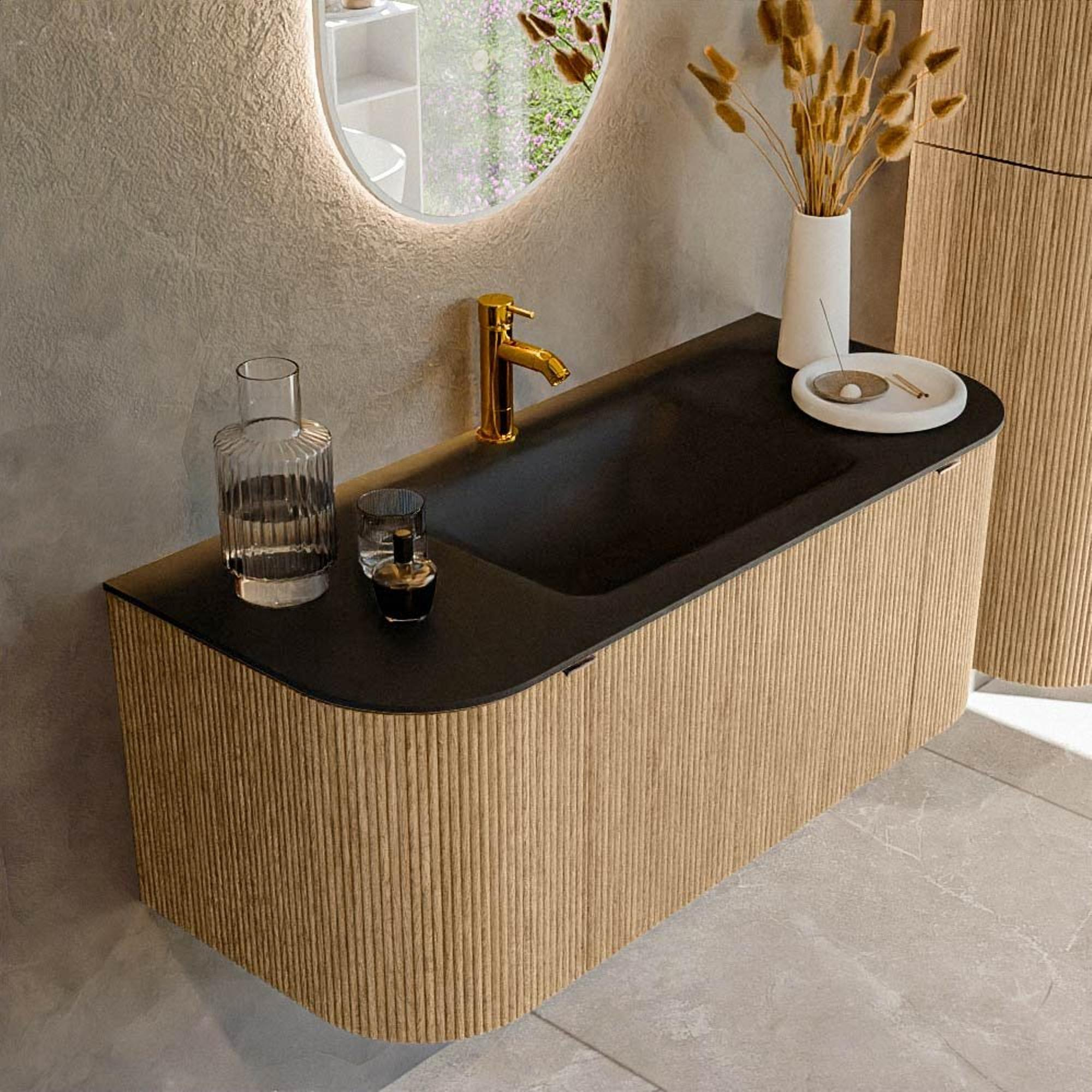 La couleur chêne mat en combinaison avec le lavabo foncé Urban crée un aspect contemporain, presque comme à l'hôtel. Le décor en bois apporte chaleur et convivialité à la pièce, tandis que la surface de lavage noire assure un contraste puissant et un aspect luxueux. La poignée intégrée renforce le caractère minimaliste : pas de poignées proéminentes qui interrompent la ligne, mais une façade calme et épurée. Grâce aux coins arrondis, l'ensemble paraît plus doux et plus accueillant qu'une variante entièrement angulaire, ce qui convient parfaitement aux salles de bains où le confort et la tranquillité sont au centre. Ainsi, ce meuble s'intègre aussi bien dans les salles de bains design modernes que dans les intérieurs scandinaves et industriels.