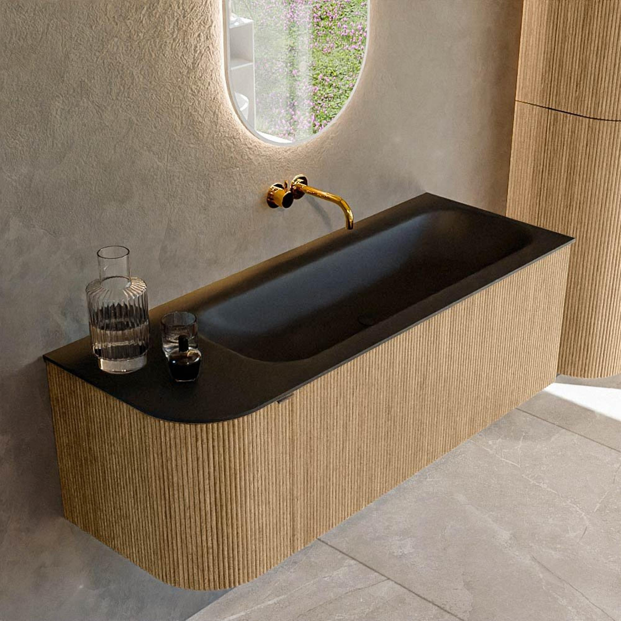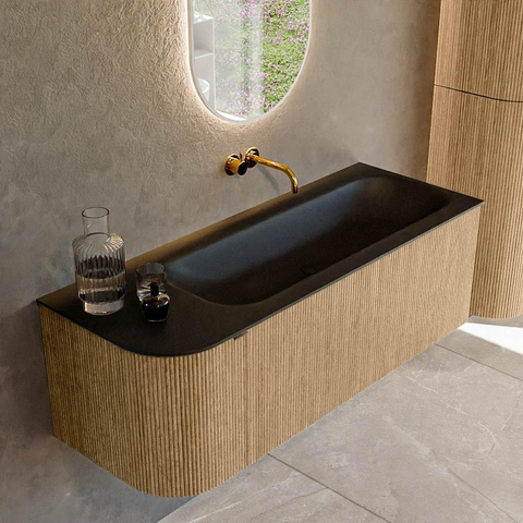La couleur chaude Oak mat donne immédiatement à votre salle de bains une atmosphère naturelle et chaleureuse, tandis que le lavabo noir Urban ajoute une touche moderne qui s’intègre parfaitement dans les intérieurs contemporains. La forme rectangulaire avec coins arrondis adoucit subtilement l’ensemble, de sorte que le meuble paraît à la fois épuré et accueillant. Cette combinaison s’accorde parfaitement avec les tendances de salle de bains populaires comme l’hôtellerie chic, le style industriel moderne et le minimalisme scandinave. Comme la vasque et le plateau sont réalisés dans une couleur foncée et uniforme, le meuble attire le regard sans être criard. Vous pouvez en outre le combiner facilement avec des robinets noirs, des accents en bois ou des carreaux effet béton, ce qui vous permet, avec quelques choix ciblés, de créer un design de salle de bains au rendu professionnel.
