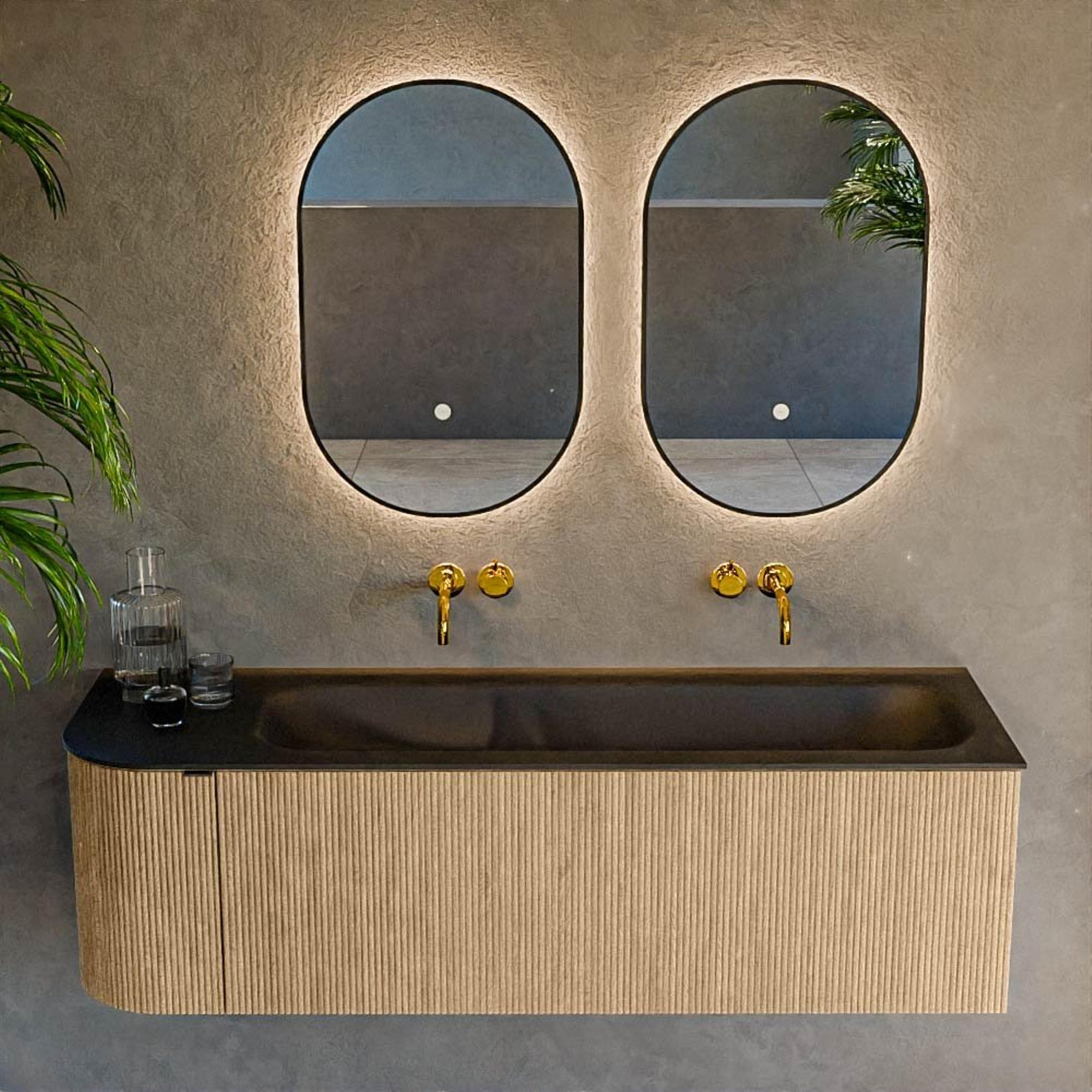La combinaison d’un meuble mat Oak avec un lavabo noir mat couleur Urban offre une apparence luxueuse et contemporaine qui s’harmonise parfaitement avec les salles de bains industrielles, modernes et scandinaves. La forme rectangulaire aux angles arrondis paraît plus douce qu’un bloc strict, tandis que la poignée intégrée garde la façade minimaliste et épurée. Grâce au lavabo positionné sur le côté droit, un agréable espace de dépose se crée à côté de la vasque, pratique par exemple pour le savon, les accessoires ou un pot de plante décoratif. La teinte bois apporte de la chaleur à la pièce, tandis que la zone de lavage noire crée un contraste marqué ; idéal si vous aimez une touche stylée tout en conservant un ensemble intemporel.
