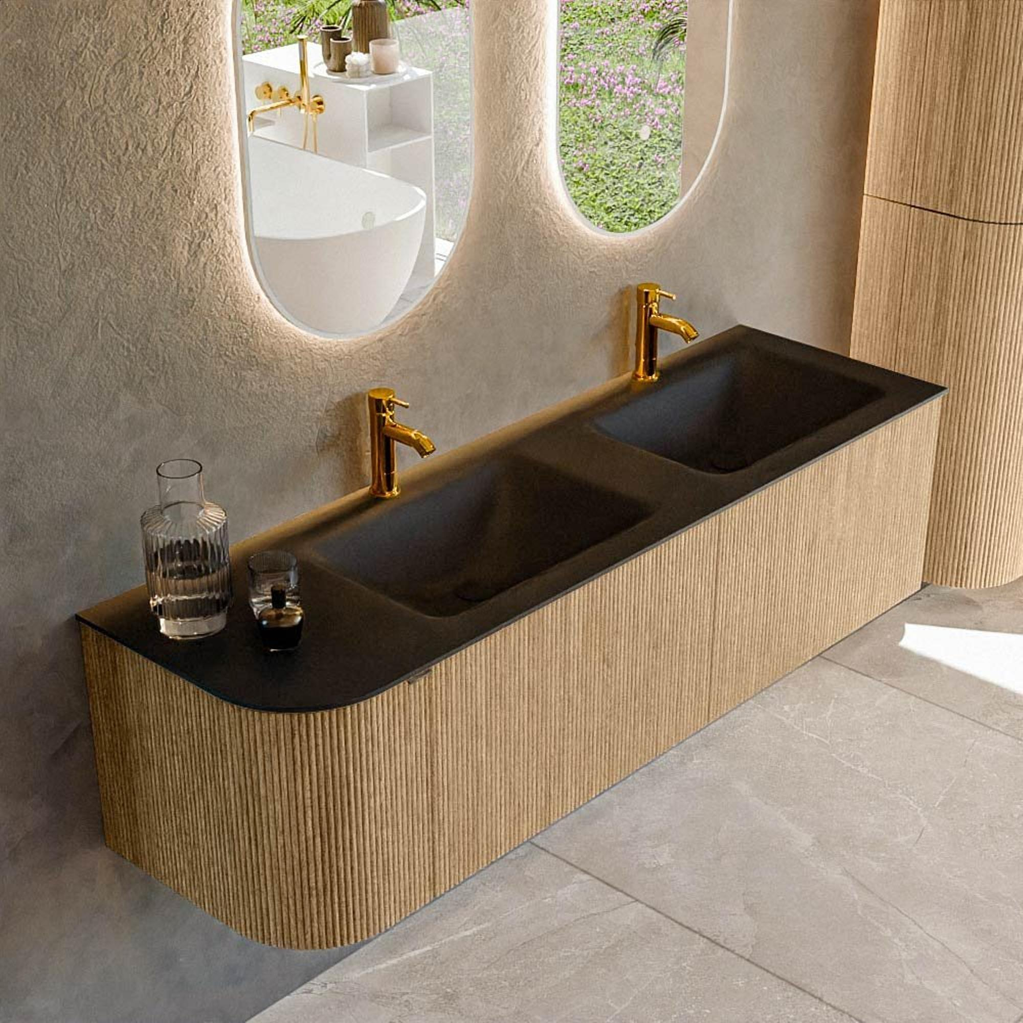 Avec deux vasques et deux trous de robinet, ce meuble offre tout l’espace nécessaire pour les matinées chargées ou lorsque vous partagez votre salle de bains. Vous devez moins attendre l’un sur l’autre et pouvez vous brosser les dents, vous maquiller ou vous raser en même temps. Le lavabo dans une couleur noire audacieuse donne un caractère marqué et moderne et se marie à merveille avec des carreaux clairs ou justement foncés. Comme le double lavabo se trouve sur le côté droit, vous pouvez aménager intelligemment l’espace de votre salle de bains, par exemple avec un passage ou une colonne haute à gauche. Cela en fait une solution attrayante aussi bien pour les grandes salles de bains familiales que pour les appartements urbains haut de gamme où vous souhaitez tirer le meilleur parti de la largeur disponible.