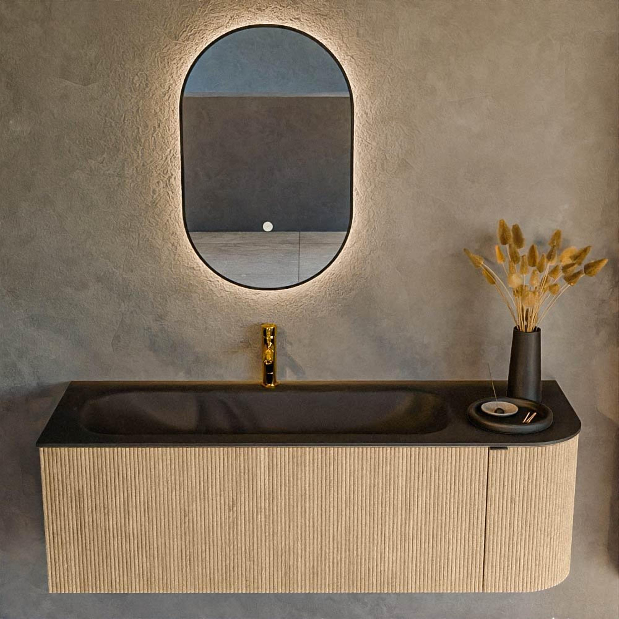 MONDIAZ KURVE Meuble de salle de bains 135 cm avec module 25 R couleur Oak avec 1 tiroir et 1 porte. Lavabo BIG MEDIUM gauche 1 trou de robinet Urban.