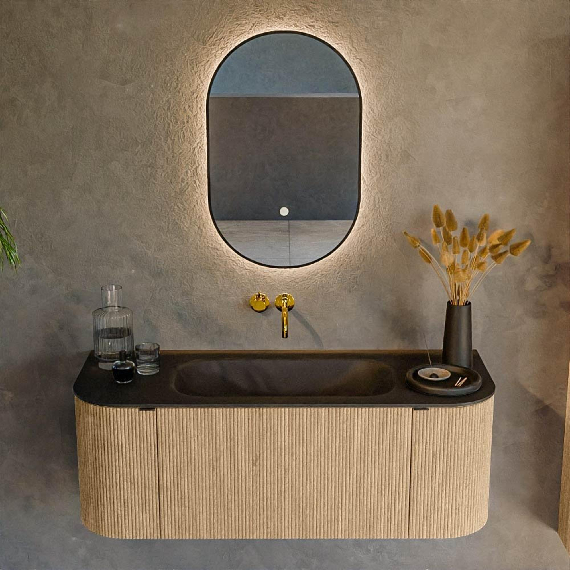 La forme rectangulaire aux angles arrondis confère au meuble un caractère doux et accueillant, sans rien perdre de sa modernité épurée. L’aspect chêne mat offre une base chaleureuse et naturelle où veines et nuances de couleur ressortent subtilement, donnant immédiatement à votre salle de bains une atmosphère confortable. La poignée intégrée dans la façade et le tiroir souligne le design minimaliste : pas de poignées saillantes, mais un ensemble sobre et linéaire. Associé au lavabo noir mat coloris Urban, cela crée un contraste élégant qui s’accorde parfaitement avec les tendances populaires telles que l’hôtel chic, l’industriel ou le Nordic chic. Grâce à cette combinaison équilibrée de matériaux et de couleurs, vous ajoutez avec un seul meuble une forte touche design à votre salle de bains.