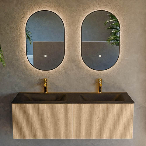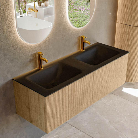 MONDIAZ KURVE 130cm Meuble salle de bain - couleur Oak - 2 tiroirs - vasque CLOUD double - 2 trous de robinet - Urban
