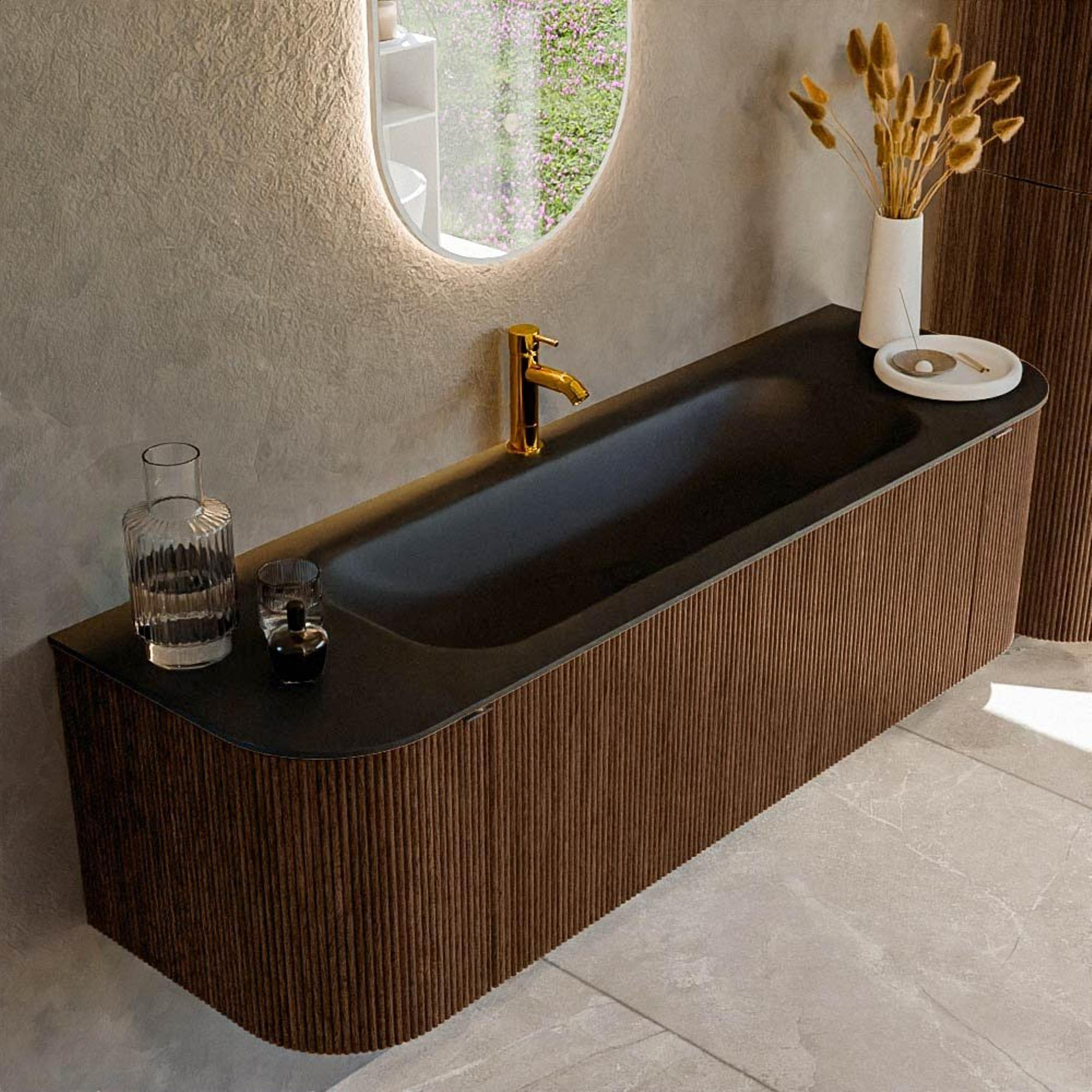 La finition walnut mate donne immédiatement à votre salle de bains une apparence chaleureuse et naturelle. Cette teinte bois se marie à merveille avec des carreaux clairs, un effet béton ou au contraire des couleurs d’accent profondes, ce qui vous laisse une grande liberté dans la conception globale. Le lavabo noir en couleur Urban ajoute un accent puissant et contemporain : parfait si vous aimez un style de salle de bains moderne ou industriel. La poignée intégrée dans la façade crée un look minimaliste et épuré sans poignées saillantes, ce qui est non seulement plus esthétique mais accroche aussi moins facilement les vêtements ou les serviettes. Grâce à la forme rectangulaire aux angles arrondis, l’ensemble paraît doux et accueillant, tandis que les lignes nettes et la finition mate confèrent justement une sensation de luxe et de design.