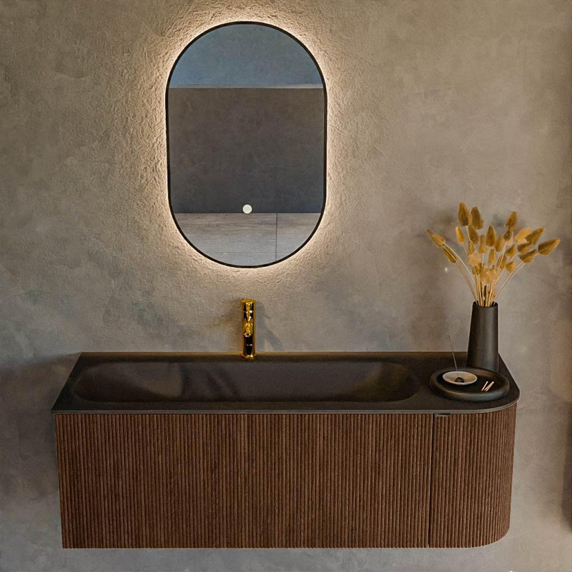 Avec une largeur de 125 cm et une profondeur de 46 cm, ce meuble offre beaucoup d’espace pratique au quotidien. Le lavabo BIG MEDIUM est positionné à gauche, ce qui vous laisse à droite un plateau généreux pour, par exemple, les produits de soin, bougies parfumées ou accessoires décoratifs. Sous le lavabo, vous trouverez un grand tiroir dans lequel vous pouvez facilement ranger serviettes, produits de soin et autres indispensables, tandis que la porte offre un espace de rangement supplémentaire pour les bouteilles plus hautes ou les produits d’entretien. Grâce au trou de robinet unique, vous pouvez choisir un beau mitigeur à votre goût, par exemple un robinet de lavabo monocommande épuré. Vous aménagez ainsi votre meuble de lavabo entièrement selon vos routines et vos souhaits, sans superflu.